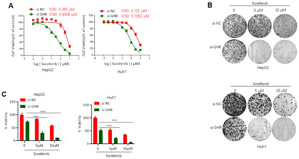 To gain insight into the functional role of GHR in sorafenib resistance for HCC treatment, si GHR was transfected into two HCC cell lines, HepG2 and Huh7, for silencing GHR. Next, we analyzed the effects of sorafenib on the cell viability of these cells with MTT assay. IC50 of sorafenib on HepG2 and Huh7 cells transfected with si GHR or si RNA were detected. Cell viability was decreased in a dose-dependent manner when cells were treated with sorafenib (Figure 2A). Sorafenib showed 50% viability inhibition on HepG2 cells with GHR blockage at 0.4009 μM, presenting a 13-fold lower IC50 value than that on HepG2 cells (IC50 = 5.265 μM). In addition, the IC50 value of sorafenib on Huh7 cells transfected with siGHR is 0.7053 μM, whereas for control cells the value is 4.722 μM. These findings suggest that GHR inhibition induces sensitization of HCC cells to sorafenib.