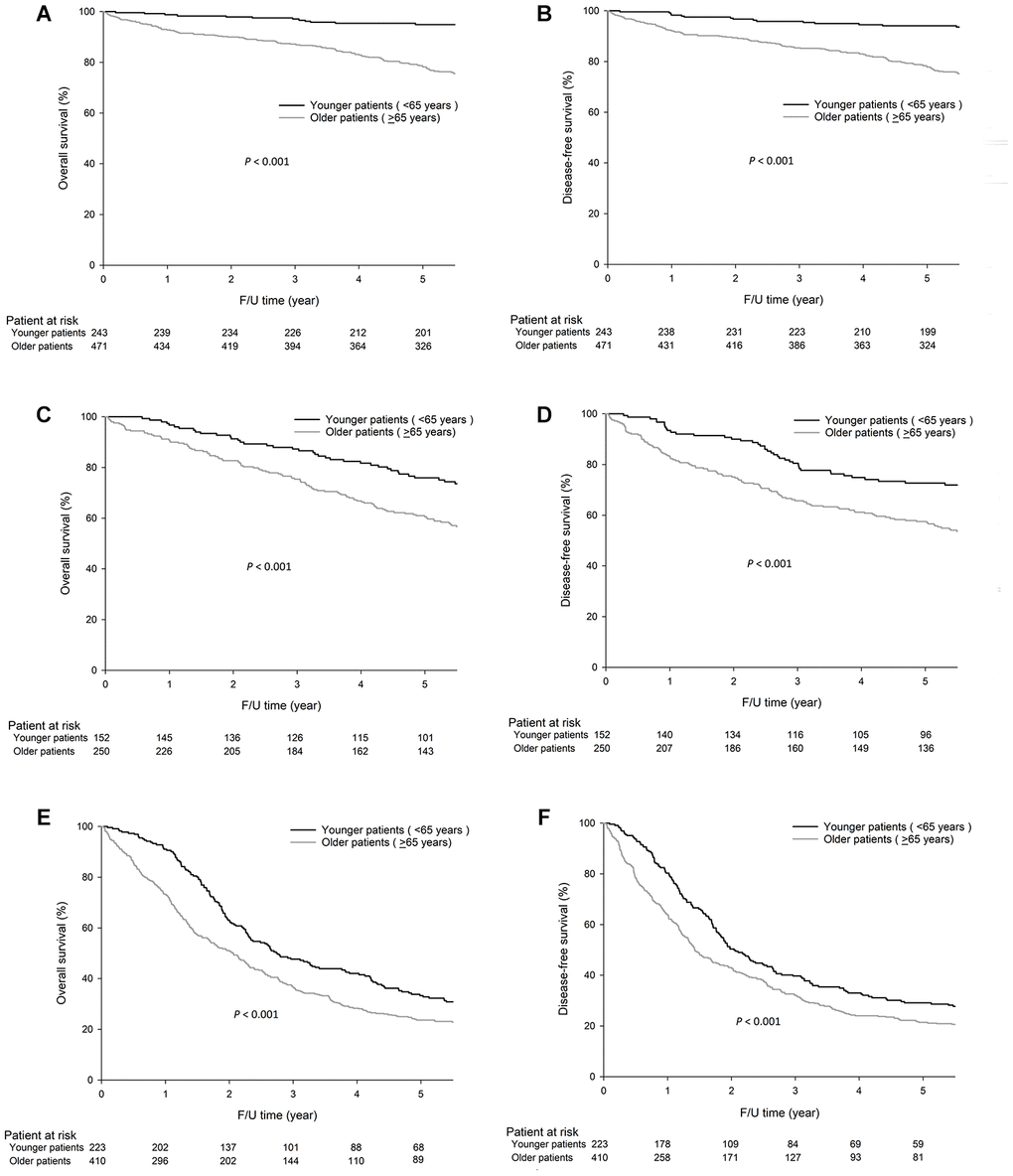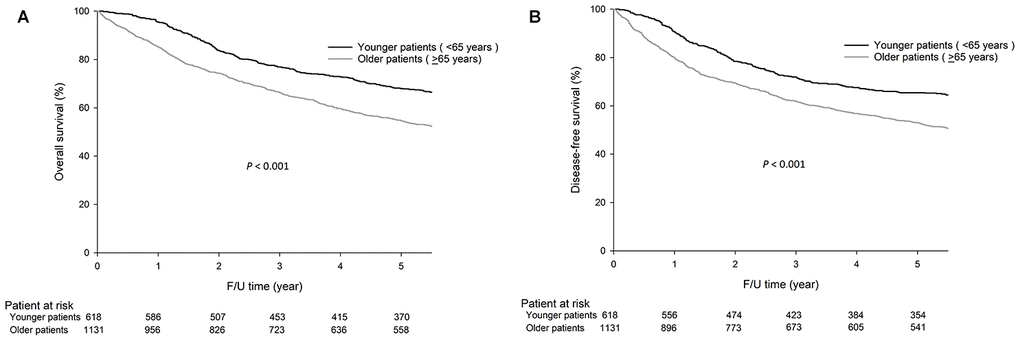 As shown in Figure 1, the 5-year overall survival (OS) (68.0% vs. 54.6%, P<0.001) and disease-free survival (DFS) (65.4% vs. 53.0%, P<0.001) rates were higher in younger patients than in older patients.