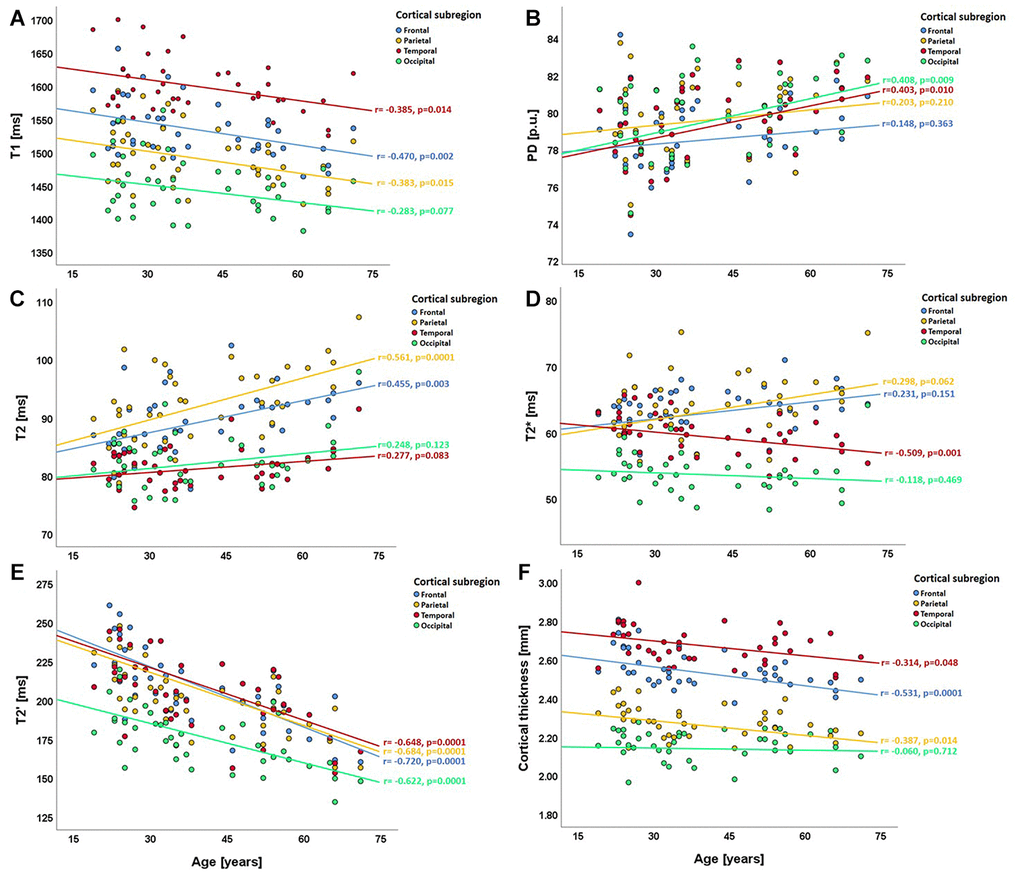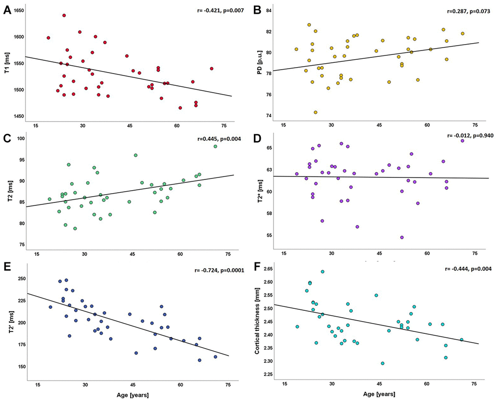 After controlling for the total intracranial volume (TIV) and sex as confounding variables by partial correlations, similar associations between qMRI parameters across the entire cortex and age were detected: quantitative T1 values showed a significant negative correlation with age (r= -0.421, p=0.009), while irreversible (T2) and reversible (T2′) quantitative transverse relaxation times showed significant correlations in diverging directions (T2: r=0.440, p=0.006 and T2′: r= -0.722, p=0.0001). There was globally no significant correlation between quantitative T2* (r= -0.030, p=0.856) or PD (r=0.306, p=0.062) values and age. Analysis of the association between global cortical qMRI parameters and global cortical thickness (controlling for the effect of the TIV) revealed a significant negative correlation between global cortical T2 and cortical thickness (r= -0.424, p=0.007), while global cortical T2′ values correlated positively with cortical thickness (r=0.647, p=0.0001). Global cortical T2* and PD values were not significantly correlated with cortical thickness (r= -0.029, p=0.861 and r=0.116, p=0.481). Among all qMRI parameters that were globally correlated with age, only cortical T1 values did not show a relationship with cortical thickness (r= -0.021, p=0.898).
