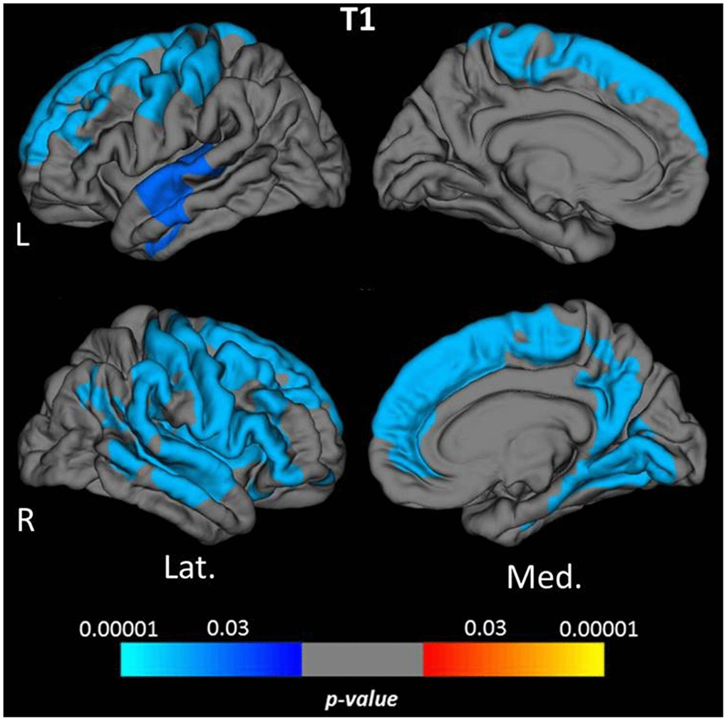 For the analysis of MRI parameters in the different cortical lobes a similar approach was followed as described in a previous study [67]. In summary, the cortical atlas “PALS_B12_Lobes” was co-registered to the participants’ surfaces with the tool “mri_surf2surf. Subsequently, average qMRI and thickness values were extracted for all participants from the frontal, temporal, parietal and occipital cortical regions of interest. Since surface-based analysis demonstrated mostly symmetric distributions across both hemispheres, parameter values averaged across both hemispheres were used to test for Pearson correlations with age for the cortical regions. Furthermore, for each cortical area, tests for Pearson correlations of the qMRI parameters and the cortical thickness in the respective region were performed, using the TIV as a covariate. P values below 0.05 were considered significant for all statistical tests.