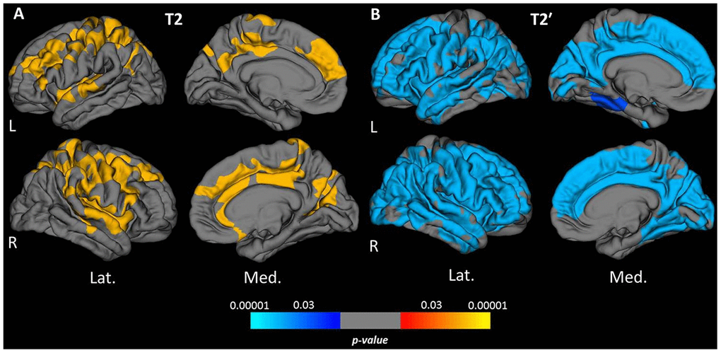In summary, the results of the study presented here suggest that global iron deposition is the most relevant age-related microstructural cortical change, since quantitative T2′ shows the strongest correlation with age and the most widespread age-related changes across the cerebral cortex in comparison to other qMRI parameters (Figure 3B). Demyelination in higher age, as reflected by a positive correlation between T2 and age, might be most prominent in frontoparietal and upper temporal regions. Furthermore, the negative correlation between T1 and age in the same regions indicates microstructural changes affecting T1 beyond the more widespread iron deposition such as a decreasing water fraction caused by a regression of the dendrites, resulting in a relative increase of the neuronal density [17, 20]. PET research has revealed a strong age-related decrease in aerobic glycolysis and glucose consumption in frontal, parietal and temporal regions during adulthood [29]. This reduction of oxidative metabolism might affect energy-demanding repair processes and increase oxidative stress. The presented results indicate that these metabolic changes might be associated with demyelination and a regression of the dendrites, resulting in changes in water content, while global iron deposition might be caused by independent global metabolic processes.