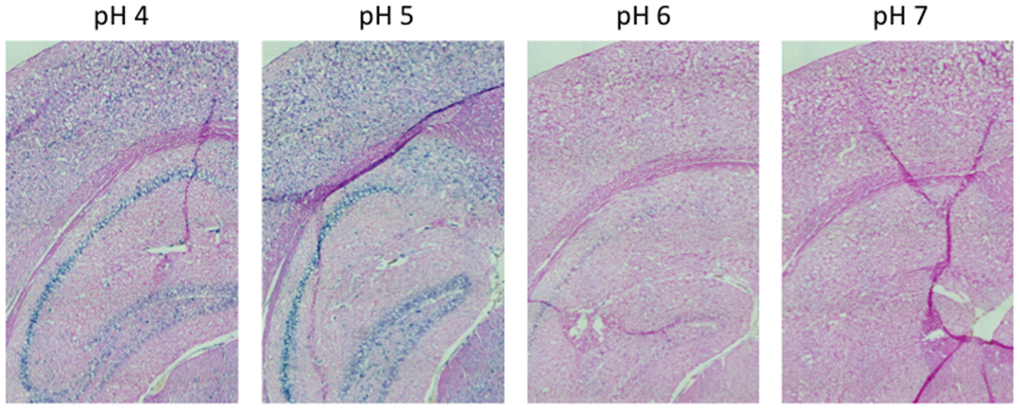 Here, we performed an analysis for SA-β-gal (pH 6.0) staining on a range of tissues of healthy mice entering middle age (9 months old): heart muscle, skeletal muscle, bone-femur, brain-cortex, brain-hippocampus, brain-cerebellum, choroid plexus, lymph nodes, intestine, pancreas, kidney, visceral adipose tissue, liver and lungs; according to a well-established protocol [18, 19]. The majority of tissues analyzed exhibited cellular populations with strong diffuse β-gal positivity at low pH values (4 to 5), which fainted or disappeared at pH 6 to 7, indicating a non SA-β-gal activity: examples of tissues following this pattern included the hippocampus and the testes (Figures 1 and 2). Conversely, we report strong SA-β-gal staining (pH 6) in cerebellum (Figure 3), choroid plexus (Figure 4), pancreatic islets (Figure 5) and basal/stem cells in the intestinal crypts (Figure 6) of adult wild type mice. A distinct β-galactosidase staining was detected from pH 4 to SA-β-gal-associated pH 6 specifically for the Purkinje cell layer, containing the large GABAergic neurons constituting the output of all motor coordination in the cerebellar cortex, and not for small granule neurons (Figure 3). Obesity or high fat diet results in the accumulation of senescent cells in the mouse brain ([1, 20]. We found a SA-β-gal staining pattern in the cerebellum of 9 weeks old adult leptin receptor deficient ob/ob mice that was identical to the one observed in wild type mice (Supplementary Figure 1), thus obesity-independent. Next, we tested the positivity of Purkinje cell layer for β-gal and for other established positive (p16, p21 and DPP4 [19, 21–24]) and negative (H3K4me3 [25]) markers of cell senescence by immunofluorescence staining in wild type mice, as recommended recently to verify a senescent phenotype [1]. Surprisingly, in the cerebellum, Purkinje cells were strongly immunopositive for p16, p21 and DPP4 expression, while they were negative for H3K4me3 that instead stained intensely small granule neurons (Figure 7). Within the central nervous system (CNS) of wild type mice, we detected a distinct β-gal staining at pH 4 and SA-β-gal staining at pH 6 specifically in the choroid plexus, which produces the cerebrospinal fluid in the ventricles of the brain and consists of modified ependymal cells (Figure 4). The observed β-galactosidase staining pattern was identical in the choroid plexus of ob/ob mice (Supplementary Figure 2). Ependymal cells were found strongly immunopositive for p16, p21 and DPP4 expression, while staining for H3K4me3 was present but irregular and patchy compared to the other markers (Figure 8). Altogether, our findings demonstrate a bona fide senescent-like phenotype of adult mouse cell types/tissues (Purkjnie cell layer, choroid plexus, pancreatic islets and intestinal crypts), based on SA-β-gal staining and other markers of senescence.
