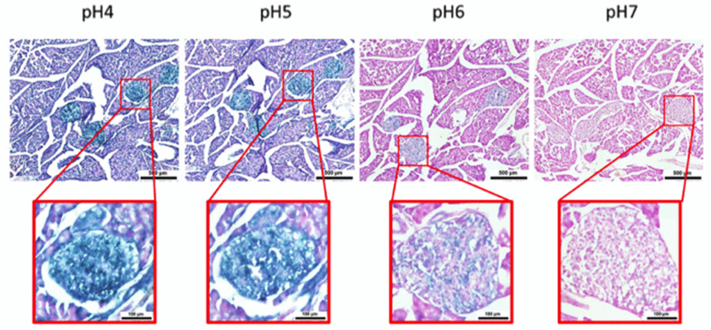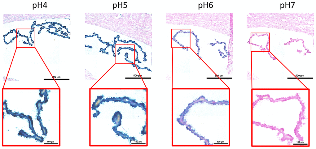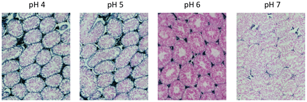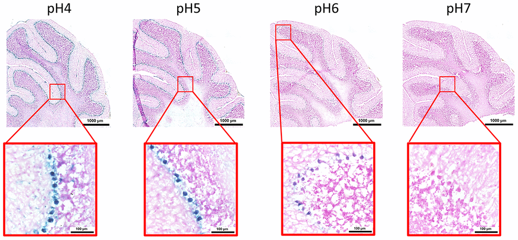 B-galactosidase detection method was performed as previously described [18, 19]. Briefly, tissues sections were fixed in 1% formalin in PBS for 1 min at RT, washed three times in PBS and incubated overnight on X-gal staining solution [1 mg/mL of X-gal (VWR), 40 mM citric acid/sodium phosphate buffer, 5 mM potassium ferricyanide (Sigma), 5 mM potassium ferrocyanide (Sigma), 150 mM NaCl, and 2 mM MgCl2] at 37°C in a humidified chamber. The experiments were carried out using staining solutions at different pH (from 4 to 7) to assess the SA-β-gal activity. Samples were rinsed with distilled water and counterstained with Nuclear Fast Red (Sigma) for 5 minutes. Images were acquired using Pia-Apochromat 20x 0.8 M27objective on Axio scan Z1 (Zeiss).