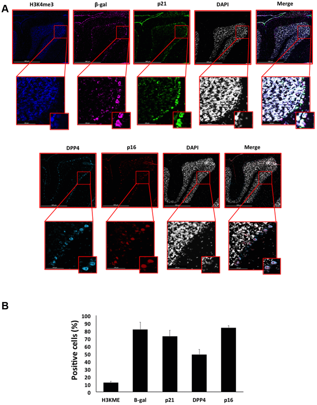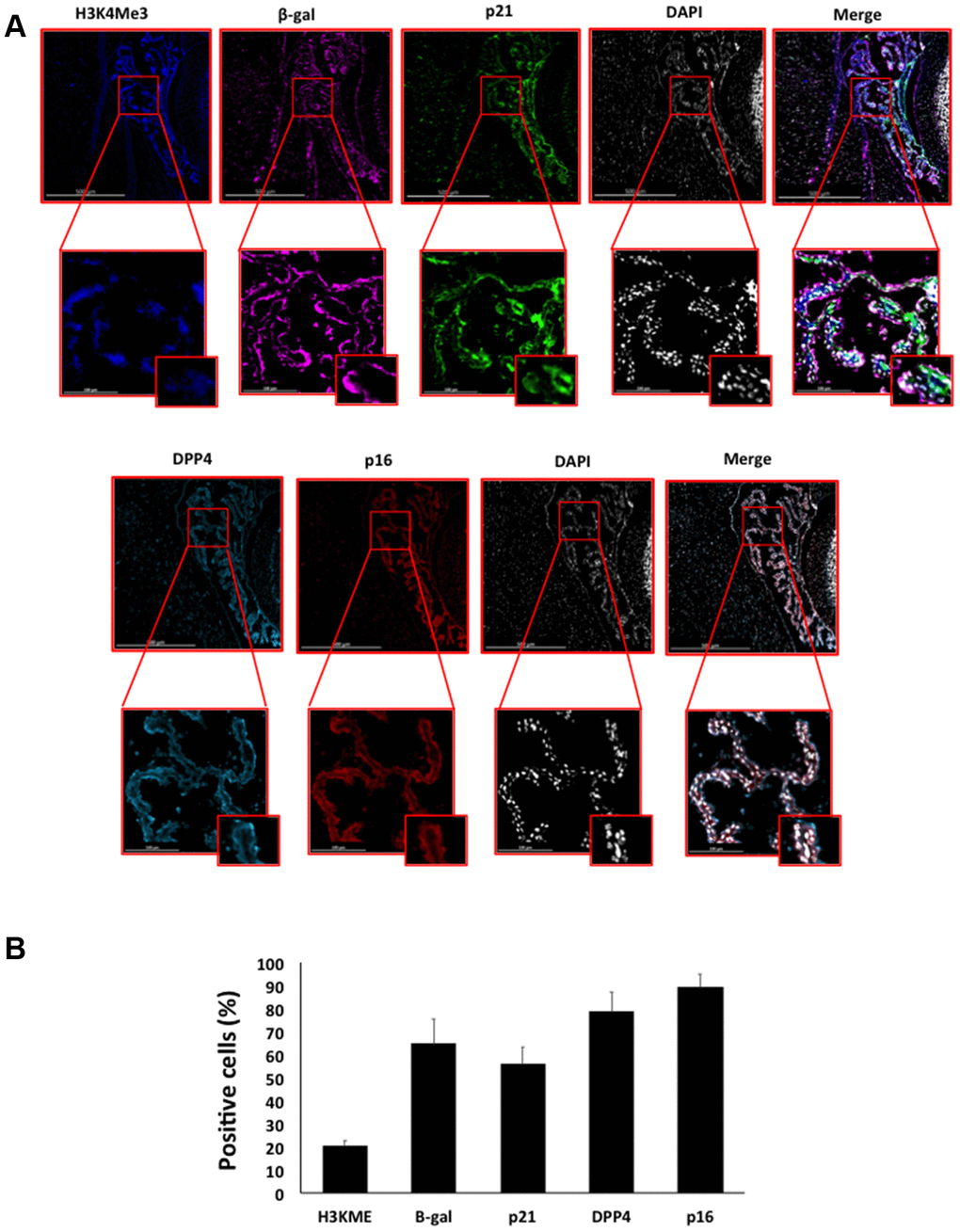 Immunofluorescence staining was performed on mice tissues sections as previously described [45–48]. Mice tissues sections were re-hydrate in PBS for 10 min and treated with the TrueBlack Autofluorescence quencher (Biotium) for 30 sec. After careful washing in PBS, sections were blocked for 60 min in M.O.M blocking solution (Vector Laboratories) and then incubated with primary antibody overnight. Two primary antibodies co-staining solutions were used on adjacent sections to detect target proteins: one mix containing p21 (ab80633), B-gal (ab9361) and H3K4me3 (ab213224); and another mix containing CDKN2A/p16INK4a (ab189034) and anti-DPPIV/CD26 (R&D Systems MAB1180). All the antibodies were used at 1:500 dilution except for anti-DPPIV/CD26 that was used at 1:1000. The staining was developed using Alexa fluorescent (488, 555, 647) conjugated secondary antibodies, and images were acquired using Axio scan Z1 (Zeiss).