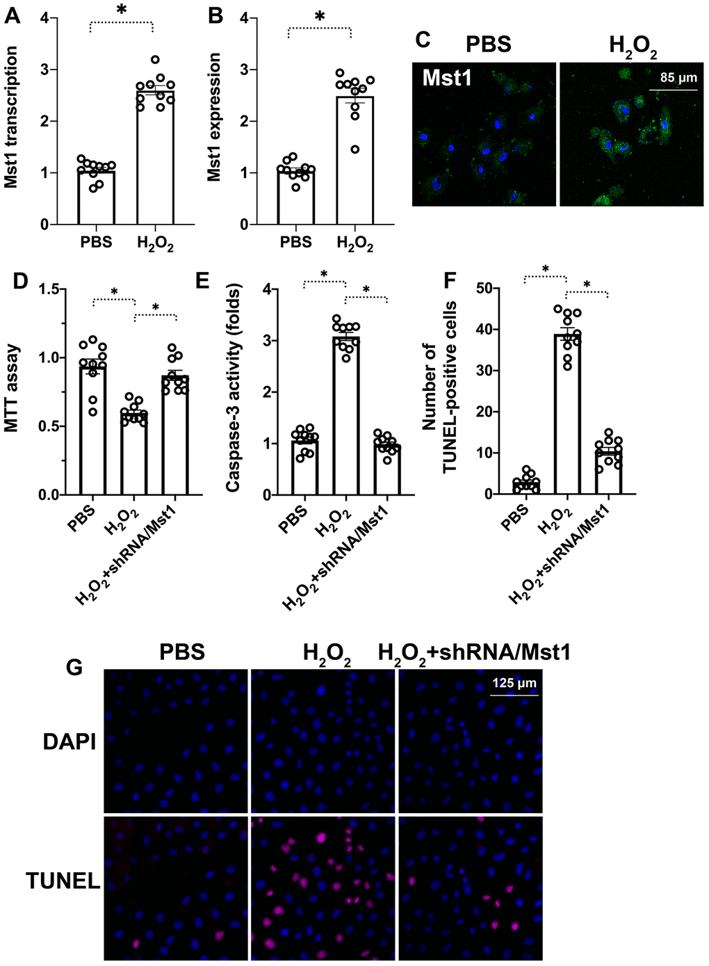 Next, we knocked down Mst1 in RA-FLSs using Mst1-specific shRNA (sh-Mst1) and investigated the oxidative stress response of Mst1-silenced RA-FLSs. MTT assay results demonstrated that the viability of H2O2-treated Mst1-silenced RA-FLSs was significantly higher compared to the viability of H2O2-treated RA-FLSs (Figure 1D). Furthermore, ELISA assays showed that caspase-3 activity was significantly lower in the H2O2-treated Mst1-silenced RA-FLSs compared to the H2O2-treated RA-FLSs (Figure 1E). TUNEL assay showed that apoptotic rate of H2O2-treated RA-FLSs was significantly higher compared to untreated controls and H2O2-treated Mst1-silenced RA-FLSs (Tunel-positive cells: 38% vs. 3% vs. 10%; Figure 1F–1G). This suggests that Mst1 mediates oxidative stress-induced apoptosis in the RA-FLSs.