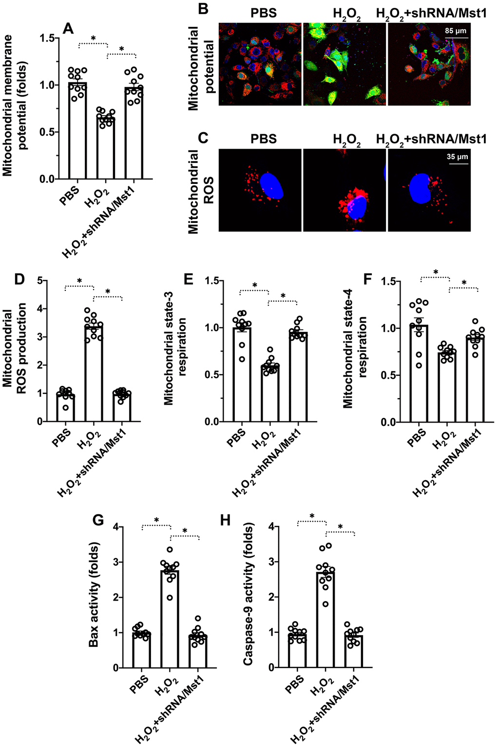 Mitochondria play a significant role in the regulation of cellular apoptosis and oxidative stress [18, 19]. Therefore, we investigated if Mst1 promotes apoptosis in H2O2-treated RA-FLSs by triggering mitochondrial dysfunction. Mitochondrial membrane potential was significantly reduced in the H2O2-treated RA-FLSs compared to untreated controls and H2O2-treated Mst1 knockdown RA-FLSs based on JC-1 staining (Figure 2A, 2B). ELISA assay showed that state-3 and state-4 mitochondrial respiration was significantly decreased in the H2O2-treated RA-FLSs compared to the untreated controls, but remained higher in the H2O2-treated Mst1 knockdown RA-FLSs (Figure 2C, 2D). ROS levels were significantly higher in the H2O2-treated RA-FLSs compared to the untreated controls, but lower in the H2O2-treated Mst1 knockdown RA-FLSs based on DCFDA staining (Figure 2E, 2F). These results suggest that oxidative stress induces mitochondrial dysfunction by activating Mst1.