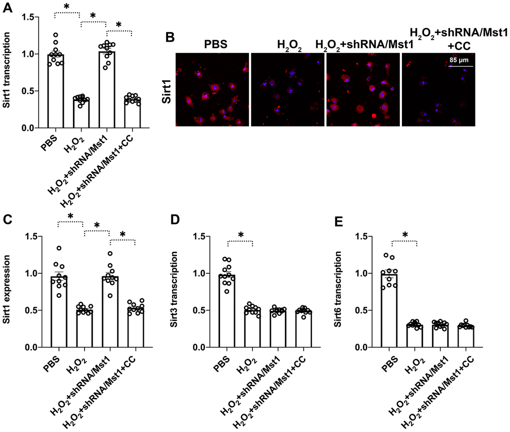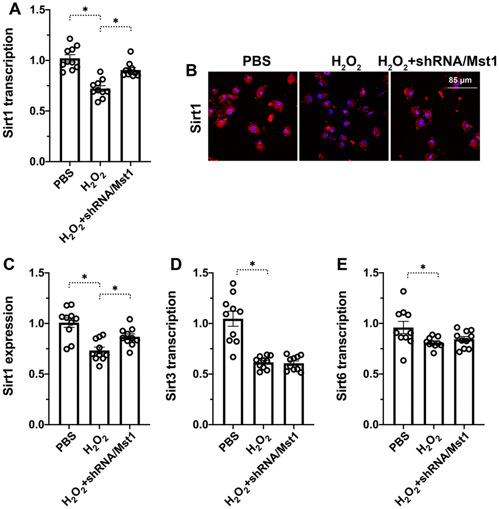 Next, we explored the downstream effectors of Mst1 that regulate mitochondrial dysfunction and apoptosis in RA-FLSs. Towards this, we investigated the functional status of Sirt1, which has been previously reported to be associated with cartilage apoptosis [16]. QRT-PCR analysis showed that Sirt1 mRNA levels were significantly reduced in H2O2-treated RA-FLSs compared to the untreated controls, but remained higher in the H2O2-treated Mst1 knockdown RA-FLSs (Figure 3A). Immunofluorescence assays showed that Sirt1 protein levels were significantly reduced in the H2O2-treated RA-FLSs compared to the untreated controls, but were higher in the H2O2-treated Mst1 knockdown RA-FLSs (Figure 3B, 3C). We then measured the mRNA expression of Sirt3 and Sirt6, the other members of the Sirtuin family, and observed that Sirt3 and Sirt6 levels were downregulated in the H2O2-treated RA-FLSs as well as H2O2-treated Mst1 knockdown RA-FLSs compared to the untreated controls (Figure 3D, 3E). Taken together, our results confirm that Mst1 specifically inhibits Sirt1 expression in oxidative stress-induced RA-FLSs.