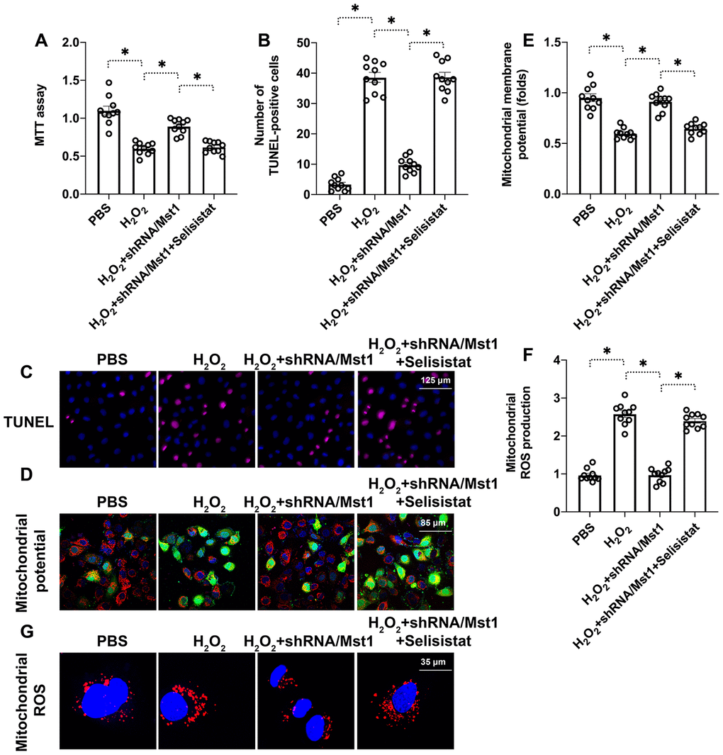 Next, we analyzed if reduced Sirt1 expression was responsible for apoptosis and mitochondrial dysfunction in H2O2-treated RA-FLSs. We used selisistat, a potent inhibitor of Sirt1 to suppress its inhibited Sirt1 in H2O2-treated Mst1 knockdown RA-FLSs using selisistat, a potent inhibitor of Sirt1, and analyzed its effects through biochemical assays. MTT assay results showed that H2O2 treatment significantly reduced the viability of selisistat-pretreated Mst1-knockdown RA-FLSs compared to the control Mst1-knockdown RA-FLSs (Figure 4A). Tunel assay showed that the numbers of apoptotic (Tunel-positive) cells were significantly higher in the selisistat-pretreated Mst1-knockdown RA-FLSs compared to the control Mst1-knockdown RA-FLSs when treated with H2O2 (Figure 4B, 4C). Furthermore, mitochondrial membrane potential was significantly reduced (Figure 4D, 4E) and ROS levels were significantly higher (Figure 4F, 4G) in the selisistat-pretreated Mst1-knockdown RA-FLSs compared to the control Mst1-knockdown RA-FLSs upon H2O2 treatment. These results demonstrate that Sirt1 is required for survival and mitochondrial function in oxidative stress-induced Mst1-knockdown RA-FLSs.