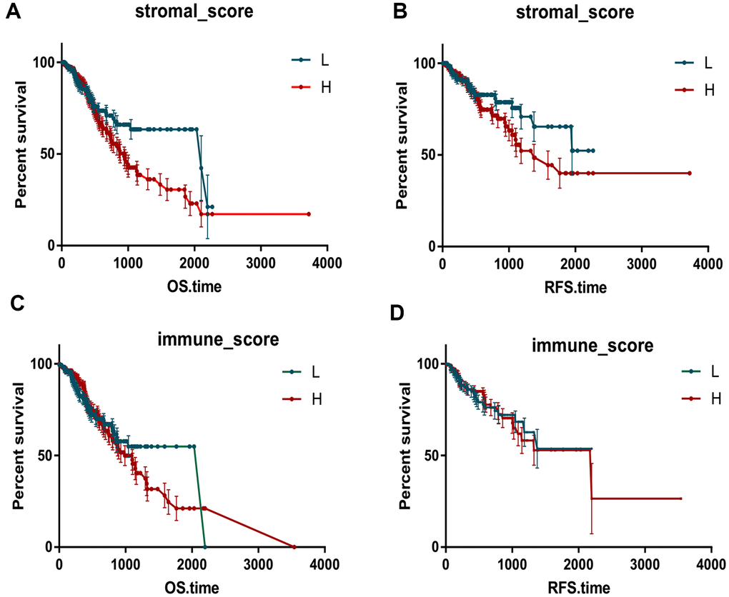 The gene expression profiles and clinical information were downloaded from TCGA database, which is a landmark in cancer genomics program, and involves molecular characterization of over 20,000 primary cancer and matched normal samples spanning 33 cancer types. The stromal scores and immunes scores were calculated by an open source web tool ESTIMATE (https://bioinformatics.mdanderson.org/estimate/). Kaplan-Meier plots were then constructed to analyze the overall survival and disease-free of the stromal scores and immunes scores. Next, the stromal scores and immune scores in STAD with different clinicopathological features, including stage T/N/M, CD274 expression and TP53 mutation, were systematically compared.