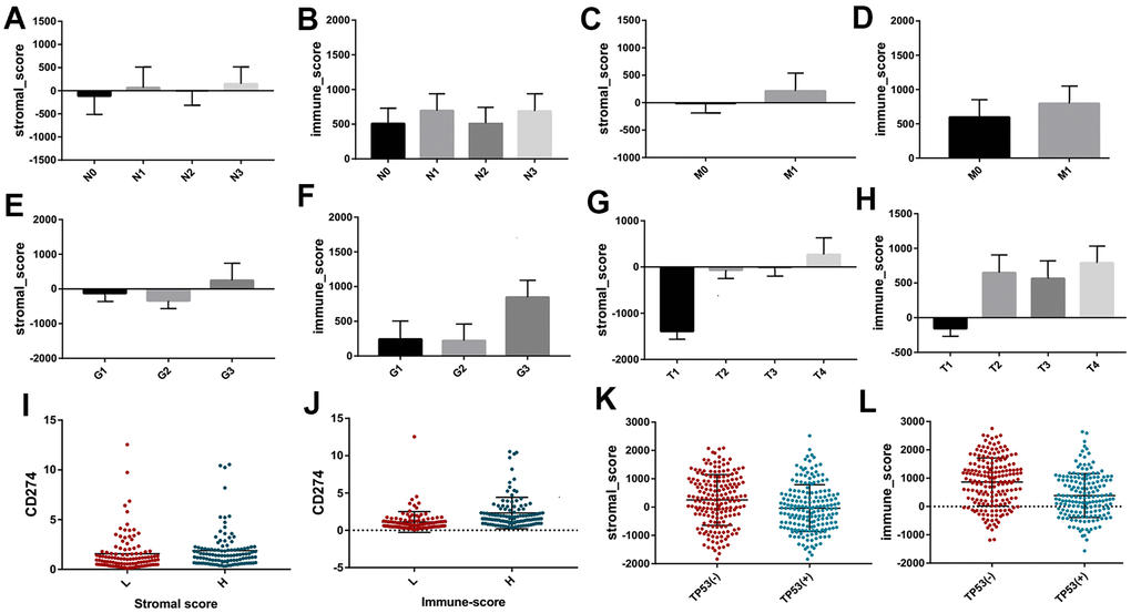 To investigate the prognostic value of immune-related scores (stromal scores and immune scores) in STAD, all the 317 STAD cases were divided into high and low groups based on their immune and stromal scores to find the association between the survival rate and the scores. The results revealed that patients with low stromal scores demonstrated slightly increased overall and disease-free survival rates when compared to high stromal scores (Figure 1, P < 0.05), while the overall survival rate of low immune scores was much higher than that of high immune scores (Figure 1, P < 0.05). Next, the association between the scores and clinical information were analyzed based on the data obtained from the TCGA database. Among them, the stromal scores and immune scores showed positive correlation with stages T and M as well as grade, indicating that the immune-related scores might contribute to STAD progression, while only stromal scores were positively correlated with stage N (Figure 2, P < 0.005). In addition, the immune-related scores were analyzed according to CD274 expression and TP53 mutation states in STAD. As shown in Figure 2, TP53 mutant cases had lower scores when compared to those with wild-type TP53 and CD274 expressed in high score group are higher than that of low group.