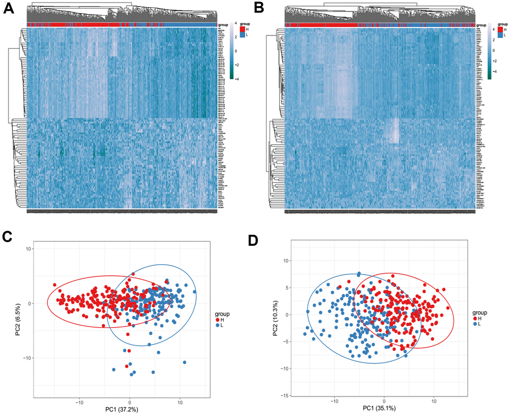 Next, the Agilent G microarray data of all 510 STAD cases obtained from the TCGA database was examined to find out the association of gene expression profiles. Heatmaps showed different gene expression profiles in the high immune-related scores vs low immune-related scores group (Figure 3A, 3B). Next, 223 DEGs were selected based on immune scores and stromal scores (fold change >1.0, P < 0.05), (Figure 4B). Also PCA and PPI network were constructed using the ClustVis (https://biit.cs.ut.ee/clustvis/), (Figure 3C, 3D and Figure 4A).