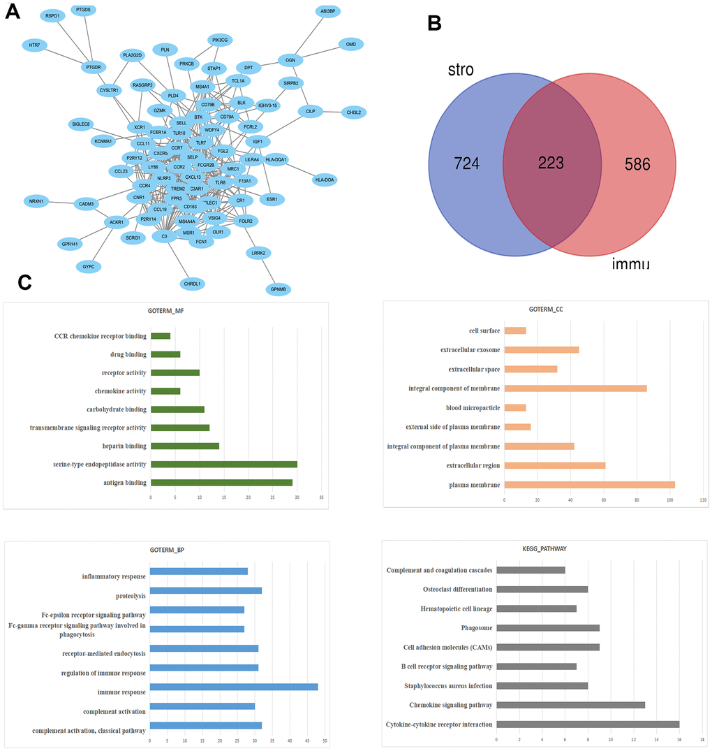 Heatmaps and principal component analysis (PCA) were constructed using R software. Differentially expressed genes (DEGs) were then identified using the limma package of the R statistical software (Fold change > 1.5 and adjusted P < 0.05 were set as the cutoff values). Venn diagram was generated based on the stromal scores and immune scores of DEGs via Draw Venn Diagram (http://bioinformatics.psb.ugent.be/webtools/Venn/). The protein-protein interaction (PPI) network was made using The Search Tool for the Retrieval of Interacting Genes (STRING). The KEGG pathway and GO enrichment analysis of DEGs were performed by DAVID (http://david.ncifcrf.gov). The top signaling pathways with false discovery rate (FDR) of <0.05, and -log FDR >1.5 were identified as significant cut-off values.