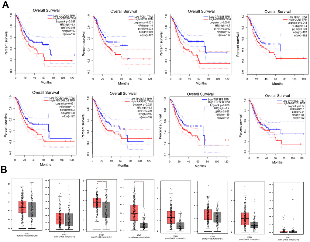 Eight hub genes were selected using BiNGO and were presented in Table 1. The selection criteria were as follows: MCODE scores >5, degree cut-off=2, node score cut-off=0.2, Max depth=100 and k-score=2. Next, Kaplan-Meier plots of the 8 hub genes were upregulated in the patients, decreasing the overall survival rate (Figure 5A). Interestingly, compared to normal tissues, GPNMB and TNFSF8 were significantly over-expressed in patients with STAD (P < 0.05) (Figure 5B).
