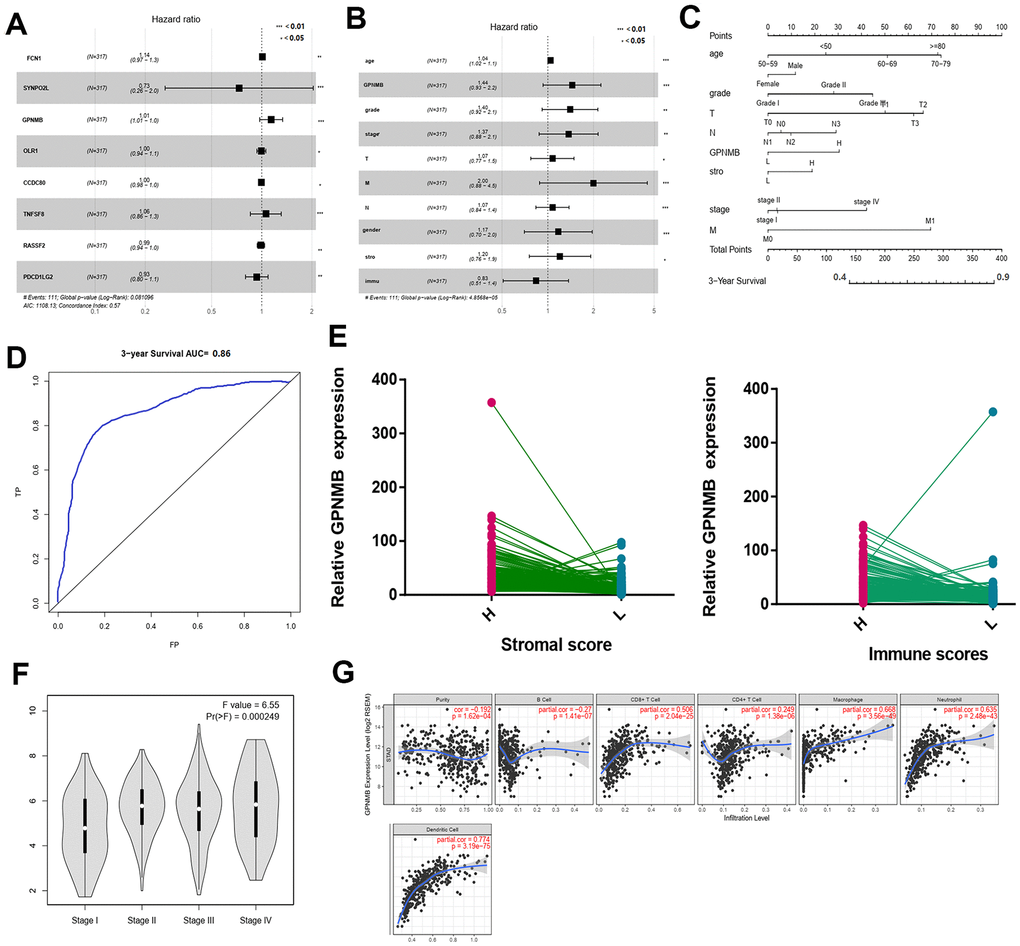 A total of 317 STAD patients were obtained from the TCGA. The demographic and clinicopathological characteristics of patients are listed in Table 2. The results of multivariate analysis of the 8 genes are listed in Figure 6A. Among these genes, GPNMB was considered as significantly risky gene with HR > 1 and P < 0.05. Multivariate analysis of GPNMB expression, related scores and clinicopathological characteristics revealed that its expression, grade, stage and stromal scores were statistically significant factors for the progression of STAD (Figure 6B). In addition, all the input factors should be incorporated into the nomogram later as adjustment items. The prognostic nomogram by integrating all significant independent factors from the multivariate analysis for predicting the overall survival rate in the training cohort was shown in Figure 6C. The area under the curve of ROC in prognostic nomogram for overall survival prediction was 0.86 (95%CI, 0.80 to 0.92) (Figure 6D). Interestingly, compared to low scores group, GPNMB showed significant overexpression in high immune-related score STAD group (Figure 6E). Also expression of GPNMB showed positive correlation with stage and immune infiltration including CD8+T, macrophages, neutrophils and dendritic cells (Figure 6F, 6G).