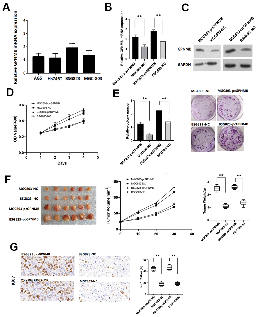 To further study the biological significance of GPNMB in STAD patients, MGC803-pcGPNMB and BSG823-pcGPNMB cells were subcutaneously injected and their corresponding controls into nude mice and monitored their tumor growth. Compared to the control cells, MGC803-pcGPNMB and BSG823-pcGPNMB cells demonstrated a significantly larger tumor size. In addition, the high GPNMB levels in STAD cells showed association with higher tumor growth rates and larger tumor weight (Figure 7F). Immunohistochemical experiments revealed that the Ki67 positive rate in high-GPNMB group was significantly higher than that of the control group (Figure 7G). Taken together, these data suggest that GPNMB promotes the growth of STAD tumors in vivo.