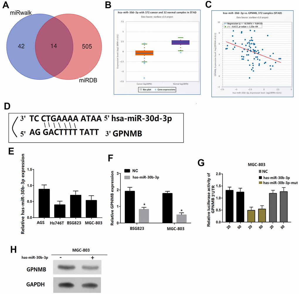 The potential miRNAs targeting GPNMB were downloaded from miRanda and miRDB databases. We performed survival analysis of miR-30d-3p in STAD downloaded from TCGA. The expression values of miRNAs from miRNA-seq data were scaled with log2(RPM+0.01). Co-expression analysis for miR-30d-3p and GPNMB were performed via ENCORI, which mainly focuses on miRNA-target interactions and is an open-source platform for studying the miRNA-ncRNA, miRNA-mRNA and RBP-mRNA interactions from CLIP-seq, degradome-seq and RNA-RNA interactome data (https://web.archive.org/web/20110222111721/http://starbase.sysu.edu.cn/).