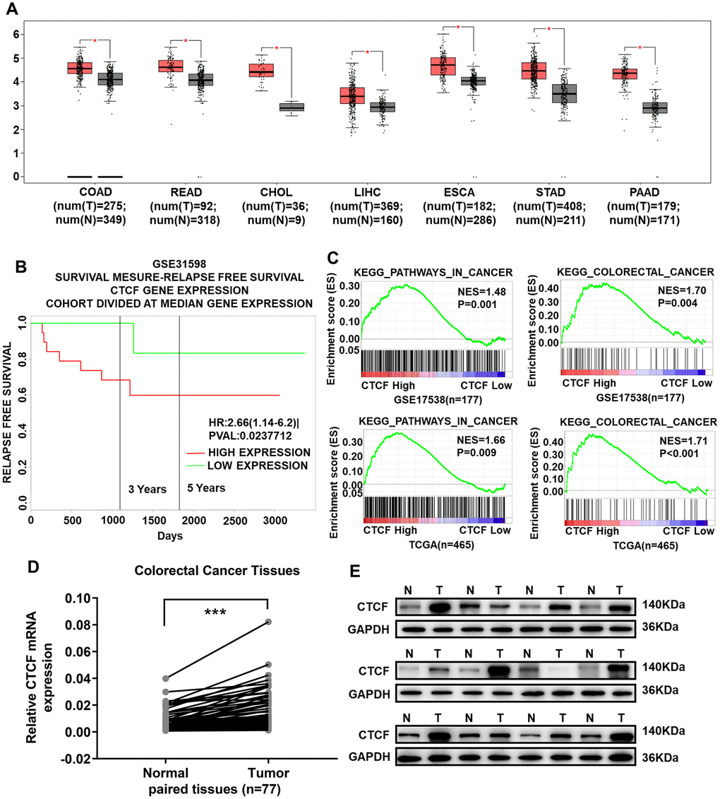 Figure 1. CTCF is significantly upregulated in CRC tissues and acts as a potential oncogenic gene. (A) CTCF is upregulated in all gastrointestinal tumors (GEPIA, http://gepia.cancer-pku.cn/). (B) Kaplan-Meier relapse free survival analysis in CRC patients with high or low expression of CTCF in GSE31598 via online website PROGgeneV2 (http://genomics.jefferson.edu/proggene/). (C) GSEA indicated that high expression of CTCF was positively correlated with the cancer related gene set signatures (KEGG_PATHWAYS_IN_CANCER, KEGG_COLORECTAL_CANCER) in CRC patient gene expression profiles (GSE17538, n = 177, and TCGA, n = 465). (D) qRT-PCR analysis of CTCF expression in 77 pairs of CRC patient specimens. (E) Western blot analyses of CTCF in 12 pairs of tumor and match adjacent normal tissues collected from clinical CRC patients. N for Normal, T for Tumor. The above data are presented as mean ± SEM. * P<0.05, **P<0.01, and ***P<0.001.