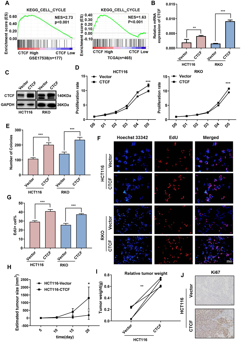 Figure 2. Upregulation of CTCF promotes human CRC cells proliferation. (A) GSEA plot indicated that high expression of CTCF is positively correlated with the cell cycle gene set signatures (KEGG_CELL_CYCLE) in published CRC patient gene expression profiles (GSE17538, n = 177, and TCGA, n = 465). (B, C) qRT-PCR and western blot analyses of CTCF expression level in constructed cell lines (HCT116 and RKO).(D, E) The relative growth rates were measured using CCK8 and colony formation assays and compared between CTCF overexpressed group and Vector group at indicated times in HCT116 and RKO cell lines. (F) Images of EdU staining in both indicated cell lines, and the relative percentage of EdU-positive cells in images of related groups are shown (G). (H, I) Tumor volume and weight were measured and analyzed. (J) The tumor sections were under IHC staining using antibody against Ki-67. The above data are presented as mean ± SEM. * P<0.05, **P<0.01, and ***P<0.001.