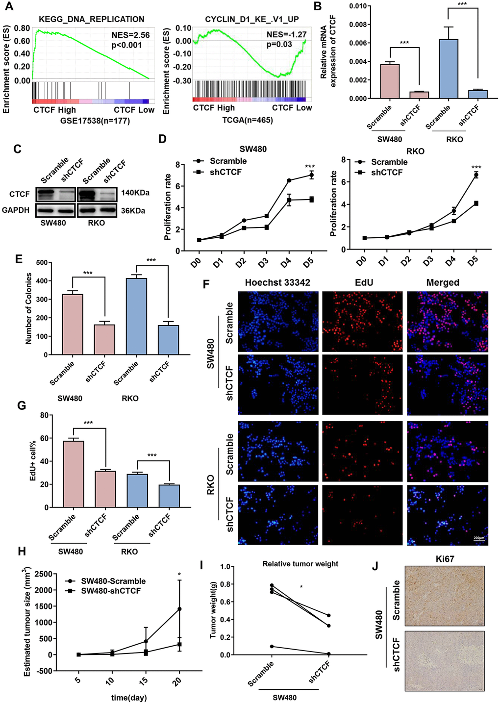 Figure 3. Inhibition of CTCF represses human CRC cells proliferation. (A) GSEA results showed that “KEGG_DNA_REPLICATION” gene set enriches in the CTCF high expression group and “CYCLIN_D1_KE_V1_UP” gene set enriches in the CTCF low expression group (GSE17538, n = 177, and TCGA, n = 465). (B, C) qRT-PCR and western blot analyses of CTCF expression level in the constructed cell lines (SW480 and RKO). (D–G) Cell reproductive capacity was examined by CCK8, colony formation and EdU staining assays. (H, I) Tumor volume and weight of subcutaneous tumor were measured and analysed. (J) Immunohistochemistry was performed to determine Ki-67 expression. The above data are presented as mean ± SEM. * P<0.05, **P<0.01, and ***P<0.001.