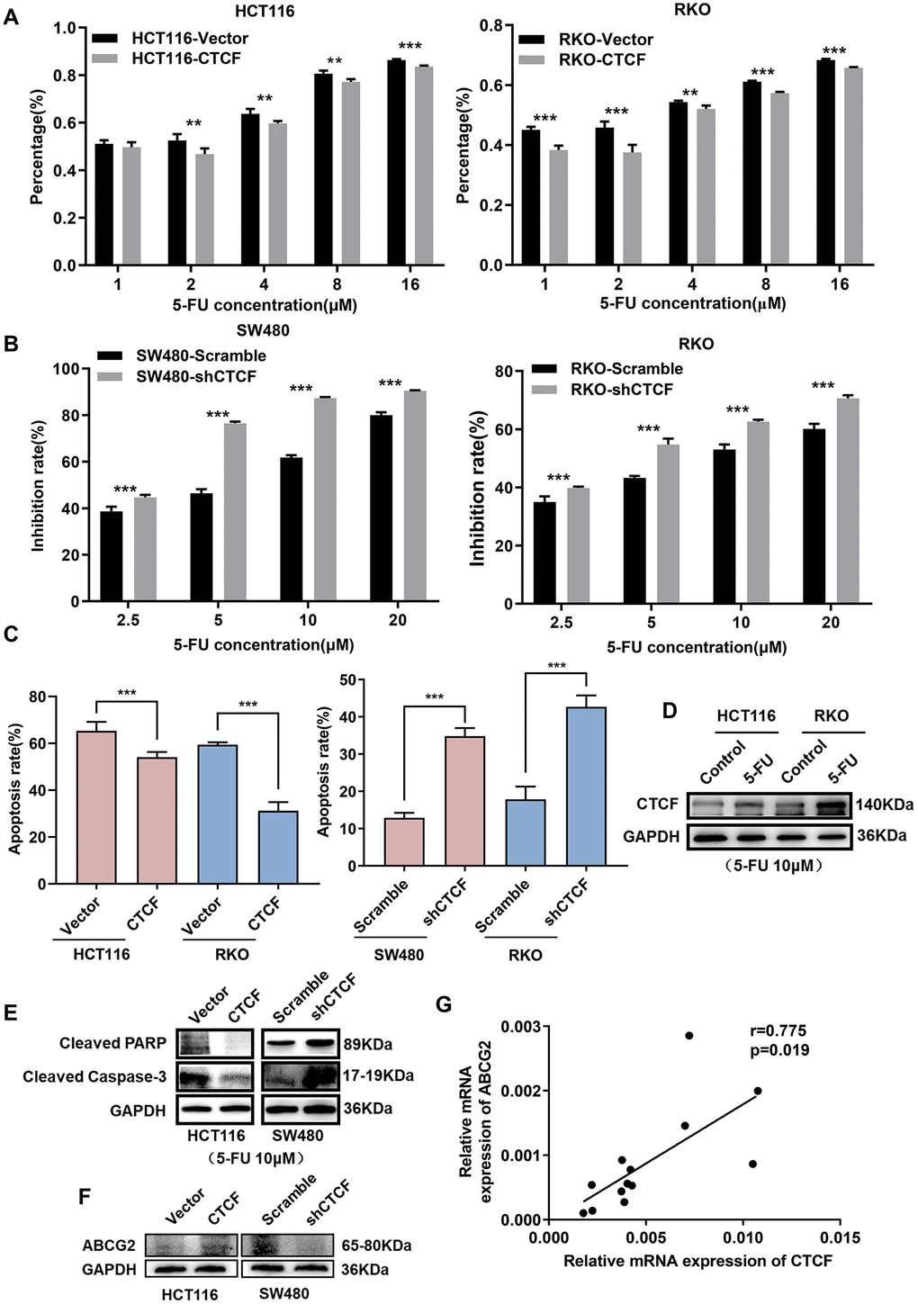 Figure 4. CTCF induces 5-FU-based chemoresistance in CRC. (A, B) Cell growth inhibition rate was measured via CCK8 analysis and compared between different groups with different treatment concentration at indicated time (48 hours). (C) The apoptosis rate of different transfected groups with 5-FU treatment were measured by flow cytometry. (D) Western blot analysis of CTCF in HCT116 and RKO cell lines after 5-FU (10 μM) treatment for 48 hours. (E, F) Western blot analyses of cleaved-PARP, cleaved Capase-3 and ABCG2 in HCT116 and SW480 cell lines. (G) Spearman correlation analyses between relative CTCF and ABCG2 mRNA expression in 13 fresh human CRC specimens. The above data are presented as mean ± SEM. * P<0.05, **P<0.01, and ***P<0.001.