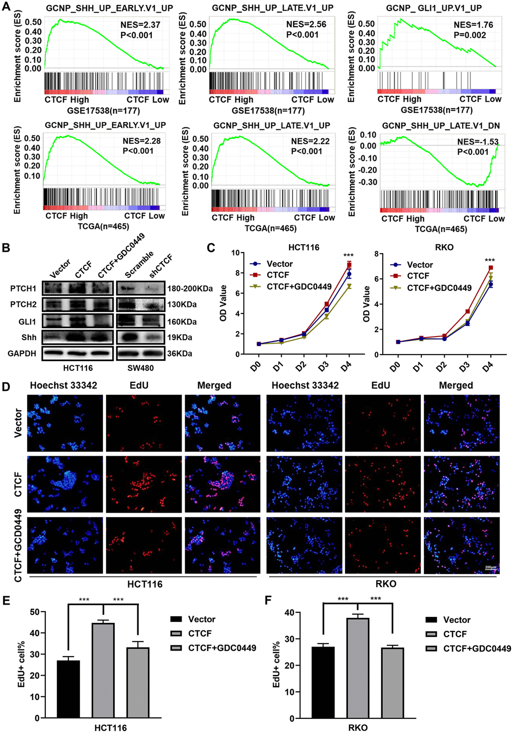 Figure 5. CTCF activates Hedgehog signaling pathway. (A) GSEA plots indicated that “GCNP_SHH_UP_EARLY.V1_UP” and “GCNP_SHH_UP_LATE.V1_UP” and “GCNP_GLI1_UP.V1_UP” gene signatures enrich in the CTCF high expression group and “GCNP_SHH_UP_LATE.V1_DN” gene set enriches in the CTCF low expression group (GSE17538, n = 177, and TCGA, n = 465). (B) Western blot analyses of Key molecules of Hedgehog signaling pathway in different transfected groups with or without the stimulation of Hedgehog signaling pathway inhibitor, GDC-0449 (2 μM). (C) Relative growth rate of different transfected groups with or without the administration of GDC-0449 (2 μM). (D–F) Images of EdU staining of both indicated cell lines with or without the administration of GDC-0449, and the relative percentage of EdU-positive cells in images of related groups is shown. The above data are presented as mean ± SEM. * P<0.05, **P<0.01, and ***P<0.001.