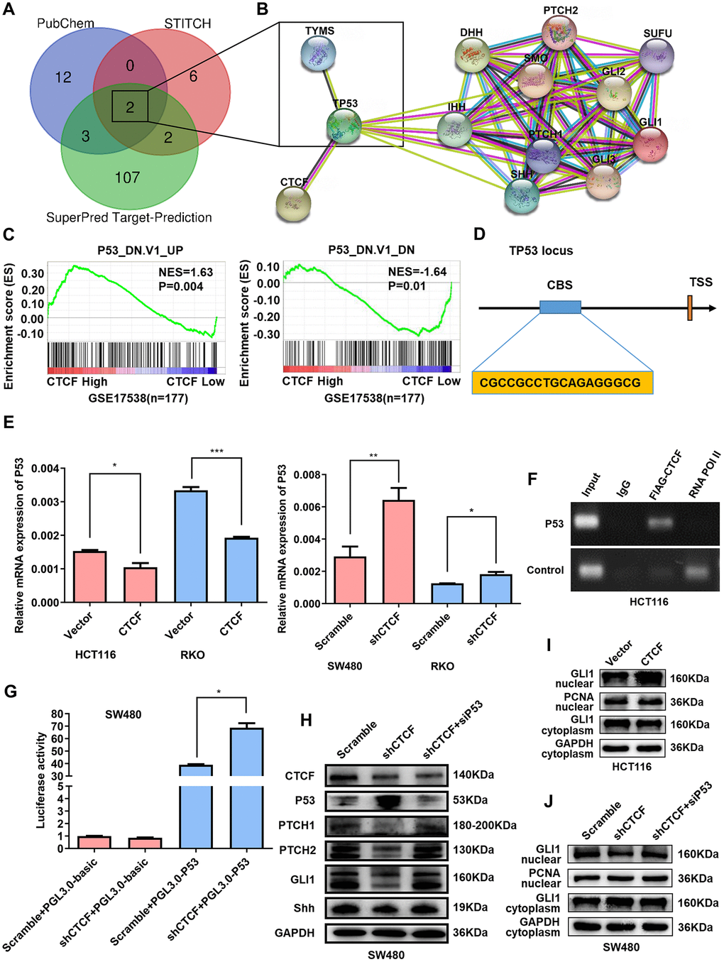 Figure 6. CTCF enhances Hedgehog signaling pathway activation via targeting P53. (A) Venn diagram enrichment analysis of the 5-FU putative target genes. (B) Protein-protein interaction analysis via STRING (https://string-db.org/). (C) GSEA plots indicated that “P53_DN.V1_UP” gene set signature enriches in the CTCF high expression group and “P53_DN.V1_DN” gene set enriches in the CTCF low expression group (GSE17538, n = 177). (D) Schematic view of the P53 gene transcription start site (TSS) with a CTCF-binding site (CBS). (E) qRT-PCR analysis of P53 expression level in constructed cell lines. (F) ChIP-PCR results for CTCF on the CBS in HCT116 cells. (G) P53 luciferase reporter activity was analyzed in SW480 cells. (H) Western blot analysis of Key molecules of Hedgehog signaling pathway and P53 in different transfected groups with or without the stimulation of P53-specific siRNA. (I, J) Nuclear extract assays and western blot analyses of GLI1 in indicated cells. The above data are presented as mean ± SEM. * P<0.05, **P<0.01, and ***P<0.001.