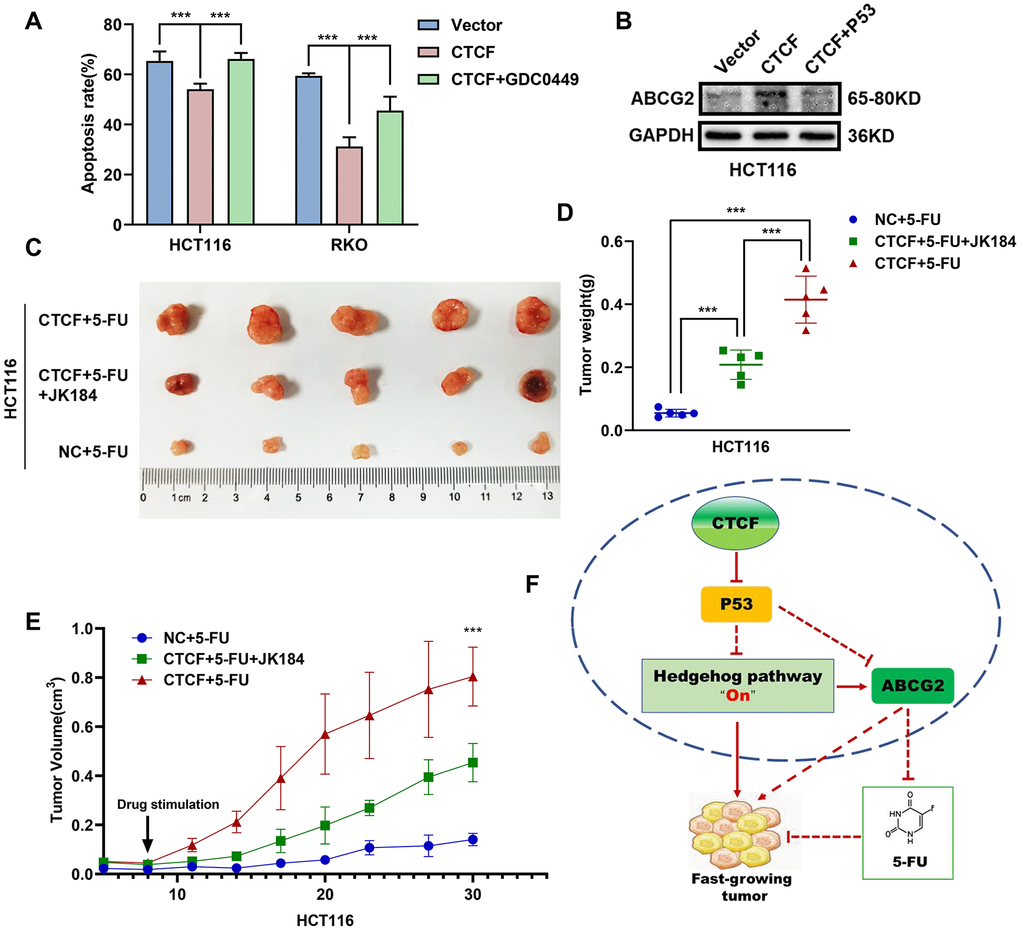 Figure 7. CTCF promotes chemoresistance by regulating P53-Hedgehog axis signaling. (A) Apoptosis assays showed the effect of GDC0449 on CTCF-mediated 5-FU stimulated apoptosis of CRC cells. (B) Western blot analysis of the effects of P53 on CTCF-mediated ABCG2 upregulation. (C) The representative images of subcutaneous tumors from different experimental groups are shown. (D, E) Tumor weight and volume analyses showed that JK184 recovered the stimulative cell proliferation caused by upregulated CTCF under stimulation of 5-FU. (F) A hypothetical model illustrating that CTCF transcriptionally represses P53 and activates the Hedgehog signaling pathway to promote proliferation and 5-FU chemotherapy resistance of CRC cells. The above data are presented as mean ± SEM. * P<0.05, **P<0.01, and ***P<0.001.
