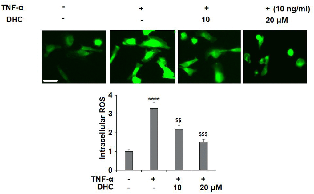 The molecular structure is shown in Figure 1. In order to investigate the effects of DHC on TNF-α-induced oxidative stress, the levels of reactive oxygen species (ROS) were measured. As shown in Figure 2, TNF-α induced a 3.3-fold increase in ROS, which was significantly reduced to 2.2- and 1.5-fold by 10 and 20 μM DHC.