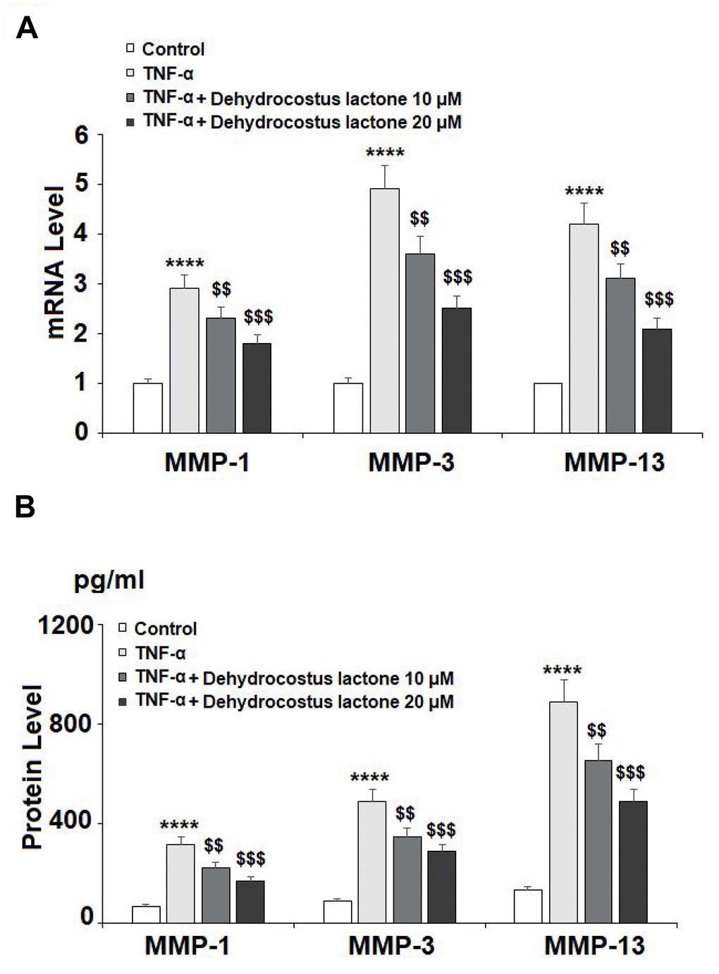 Dehydrocostus lactone (DHC) is a kind of sesquiterpene isolated from medicinal plants such as Saussurea lappa, Inulahelenium L., and Magnolia sieboldii [18]. DHC has been shown to play a protective role against inflammation and tumor formation [19]. DHC is able to prevent osteoclast-related bone loss during osteoclastogenesis by suppressing receptor activator of nuclear factor-κB ligand (RANKL)-induced osteoclast formation and osteoclast marker gene expression [20]. Another study reported that DHC inhibited the expression of inducible nitric oxide synthase enzyme and the production of NO and TNF-α in lipopolysaccharide (LPS)-activated RAW 264.7 cells [21]. Importantly, these effects of DHC are associated with inhibition of the NF-κB signaling pathway [22, 23], which is a major regulator in various inflammatory diseases. Previous research has also demonstrated an ability of DHC to inhibit the release of MMPs, including MMP-2 and MMP-9 [24]. In light of this, we hypothesized that DHC may provide protection against ECM degradation in OA. However, there have been few studies regarding the potential of DHC in the treatment of OA. In this study, we aimed to investigate whether DHC could protect the articular ECM from degradation induced by TNF-α.