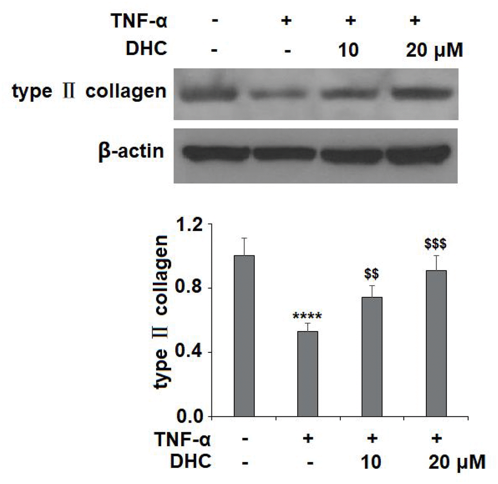 DHC prevented TNF-α-induced degradation of type II collagen by reducing the expression of MMP-1, MMP-3, and MMP-13 in human SW1353 chondrocytes