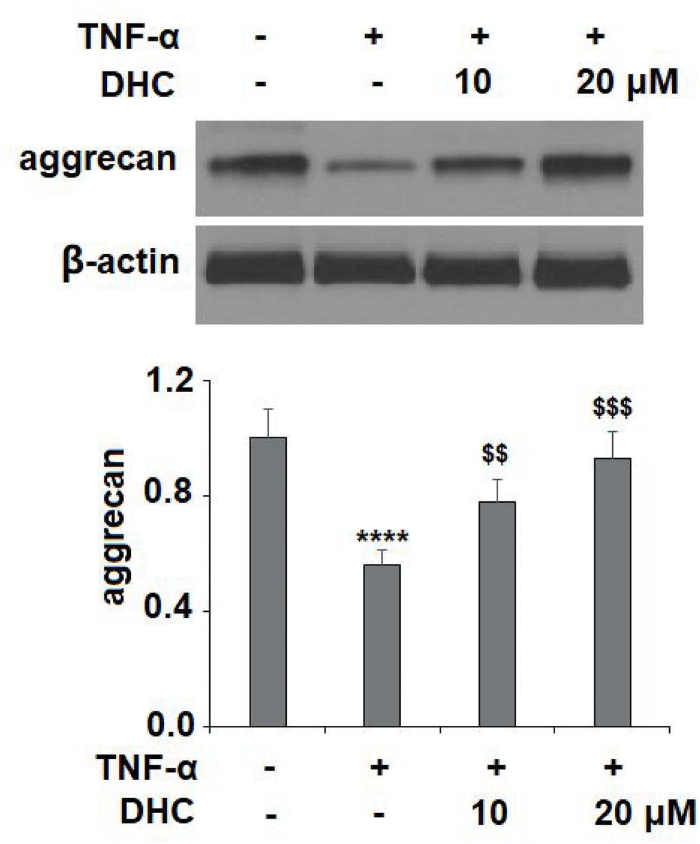 It is well known that ADAMTS-4 and ADAMTS-5 are responsible for the degradation of aggrecan. The results in Figure 6A show that TNF-α treatment increased the mRNA levels of ADAMTS-4 and ADAMTS-5 to 3.9- and 3.4-fold, which were reduced to 2.8- and 2.5-fold by 10 μM DHC, respectively. Concordantly, 20 μM DHC further decreased the mRNA levels of these enzymes to 2.1- and 1.8-fold. The results in Figure 6B show that the protein levels of ADAMTS-4 and ADAMTS-5 were significantly enhanced from 93.6 and 109.4 pg/ml to 436.6 and 551.8 pg/ml, respectively, by exposure to TNF-α alone. However, 10 and 20 μM DHC reduced the protein levels of ADAMTS-4 to 316.7 and 221.5 pg/ml, and ADAMTS-5 to 388.2 and 227.9 pg/ml, respectively. We then measured the expression of aggrecan. TNF-α treatment reduced the expression of aggrecan to 56%, which was reduced to only 78% and 93% by 10 and 20 μM DHC, respectively (Figure 7). These findings demonstrate that DHC protected aggrecan from TNF-α-induced degradation by suppressing the expression of ADAMTS-4 and ADAMTS-5.