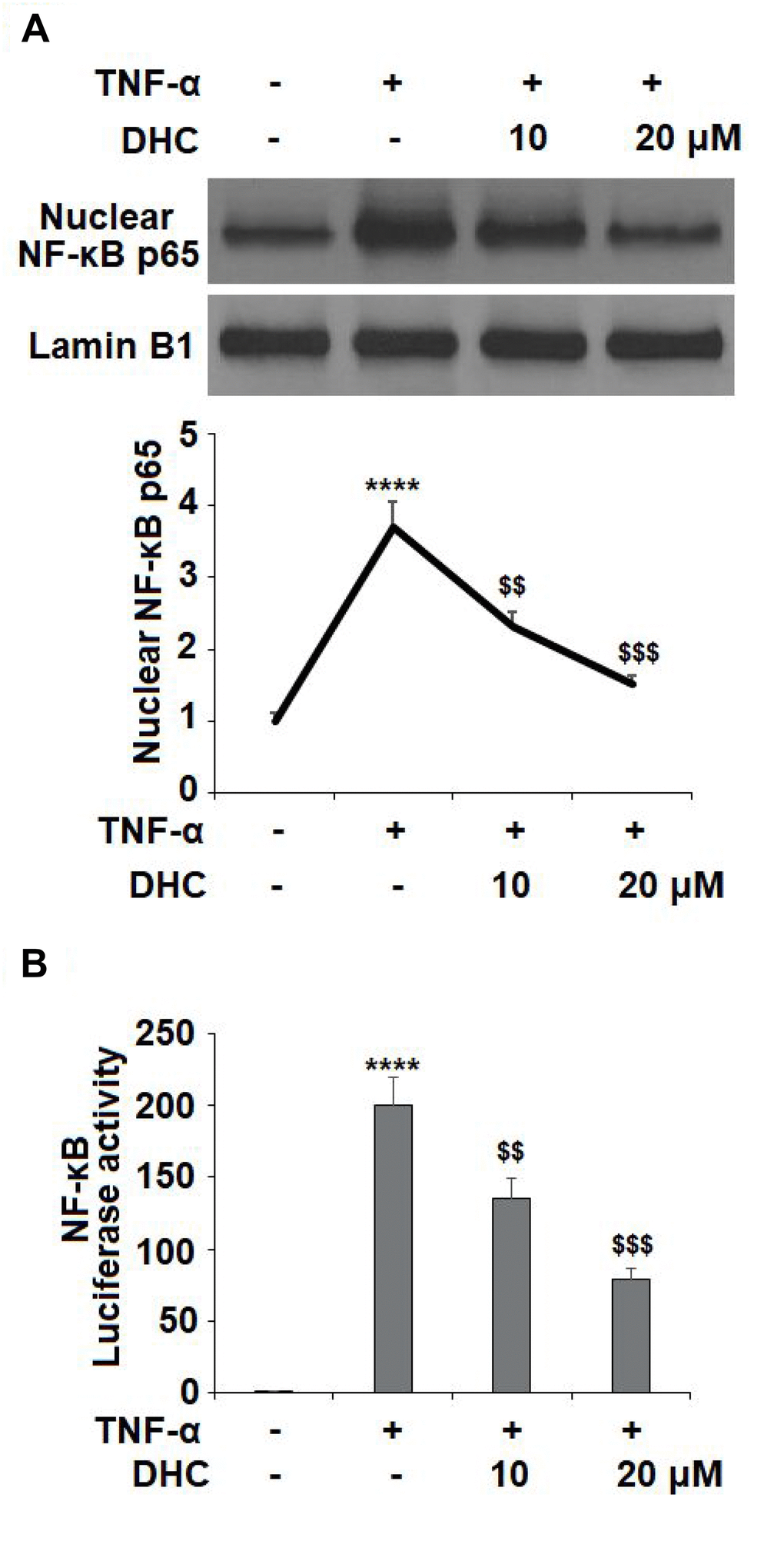 Activation of NF-κB acts as a master modulator in the development of OA by regulating the expression of various cytokines and enzymes. NF-κB is typically sequestered in the cytoplasm in an inactive state, but upon activation by TNF-α or other inflammatory cytokines, the p65 subunit of NF-κB translocates to the nucleus where it triggers the transcription and activation NF-κB. The results in Figure 8A show that TNF-α stimulation increased the nuclear level of NF-κB p65 to 3.7-fold, which was reduced to 2.3- and 1.5-fold by 10 and 20 μM DHC, respectively. Similarly, the luciferase activity of NF-κB was increased to 199.8-fold by exposure to TNF-α alone. However, the same doses of DHC inhibited the luciferase activity of NF-κB to 135.6- and 78.5- fold (Figure 8B). Thus, DHC likely exerts its anti-inflammatory effect through the inhibition of NF-κB signaling.