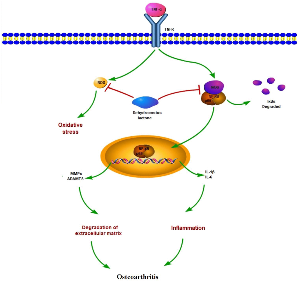 It is well known that the role of the NF-κB signaling pathway has been widely explored in various diseases and acts as a master regulator of inflammation in the development of OA [40]. The activation of NF-κB induces the expression of a large number of pro-inflammatory cytokines and chemokines that initiate the process of joint destruction. Under normal conditions, NF-κB is sequestered in the cytoplasm by IκBα, which inhibits NF-κB activity. However, when IκBα is phosphorylated, the p65 subunit translocates to the nucleus, where it triggers the activation of NF-κB and, subsequently, a cascade of deleterious effects. Thus, inhibition of NF-κB activation is often considered as a therapeutic target. NF-κB is abnormally activated in OA and as a disease-contributing factor [41]. NF-κB participates in many OA-associated events, including chondrocyte inflammation, chondrocyte proliferation, and synovial inflammation [42]. Thus, NF-κB has been considered as a promising target for the therapeutic intervention of OA. As expected, we found that DHC could suppress the activation of NF-κB by inhibiting the nuclear translocation of p65 induced by TNF-α. This finding is congruent with a recent study in which DHC was shown to inhibit osteoclastogenesis and osteoclast-mediated bone loss by inhibiting the activation of NF- κB via the suppression of IKK/IκBα/p65 signaling [20]. Another contemporary study demonstrated that DHC could inhibit NF-κB activation via modulation of the toll-like receptor (TLR) signaling pathway [43]. To our knowledge, this study is the first to demonstrate the ability of DHC to suppress NF-κB activation in chondrocytes. A graphical representation of a molecular model involved in the current study is shown in Figure 9.