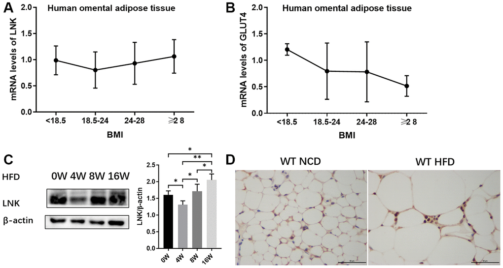 All data were presented as mean ± SEM. Statistical analyses were performed using Student’s t-test or one-way ANOVA followed by Bonferroni post-hoc test. Pearson correlation analysis was used to determine the relationship of LNK mRNA expression in adipose tissue and metabolic indexes in patients. A P-value <0.05 was considered to be statistically significant. All statistical analyses were performed using SPSS 22.0 (SPSS, Inc., Chicago, IL, USA). Figures were created with GraphPad Prism 8.0 (San Diego, CA, USA).