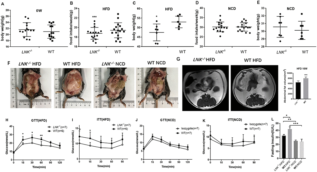 An in vivo DIO mice model was successfully built by detecting the body weight, blood glucose level in GTT as well as ITT, and MRI of the abdominal fat tissue volume. There were significant differences in food intake (Figure 2B) and body weight (Figure 2C) between LNK-/- and WT mice in HFD group (P<0.05). The abdominal anatomy of the mice under high-fat diet and normal chow diet (Figure 2F) were shown. VAT volume of HFD-fed LNK-/- mice was significantly higher than that of WT mice (Figure 2G).