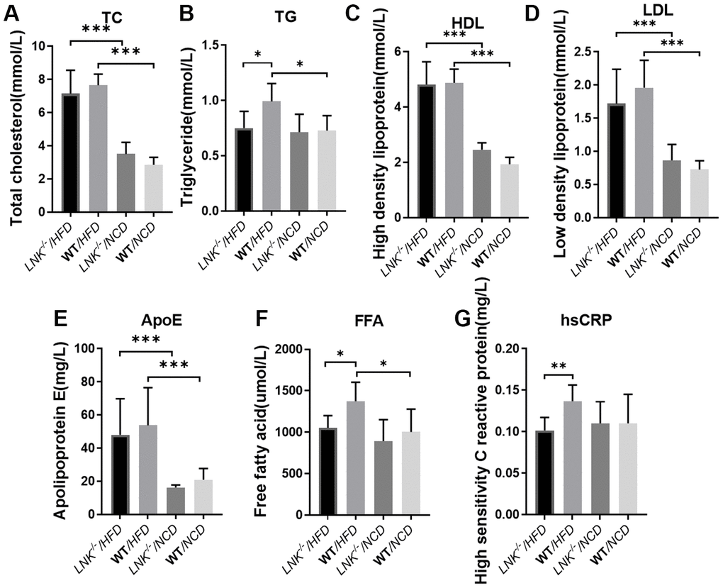 Serum lipid and liver enzyme levels were examined in both the HFD and NCD groups. The levels of fasting triglyceride (0.99 ± 0.16 mmol/L vs. 0.75 ± 0.15 mmol/L, P<0.05, Figure 3B), free fatty acids (1373.67 ± 229.25 μmol/L vs. 1051.71 ± 148.00 μmol/L, P<0.05, Figure 3F) and high sensitivity C reactive protein (0.14±0.02 mg/L vs. 0.10±0.02 mg/L, P<0.01, Figure 3G) were elevated in WT mice relative to LNK-/- mice in the HFD group. Total cholesterol (Figure 3A), HDL (Figure 3C), LDL (Figure 3D), and ApoE (Figure 3E) levels were not significantly different between LNK-/- and WT mice after 16-week HFD. However, these serum biochemical indexes were not different between LNK-/- and WT mice which were fed a standard chow diet. These data implied that the presence of LNK may impair glucose and lipid metabolism under a circumstance of obesity-induced insulin resistance.