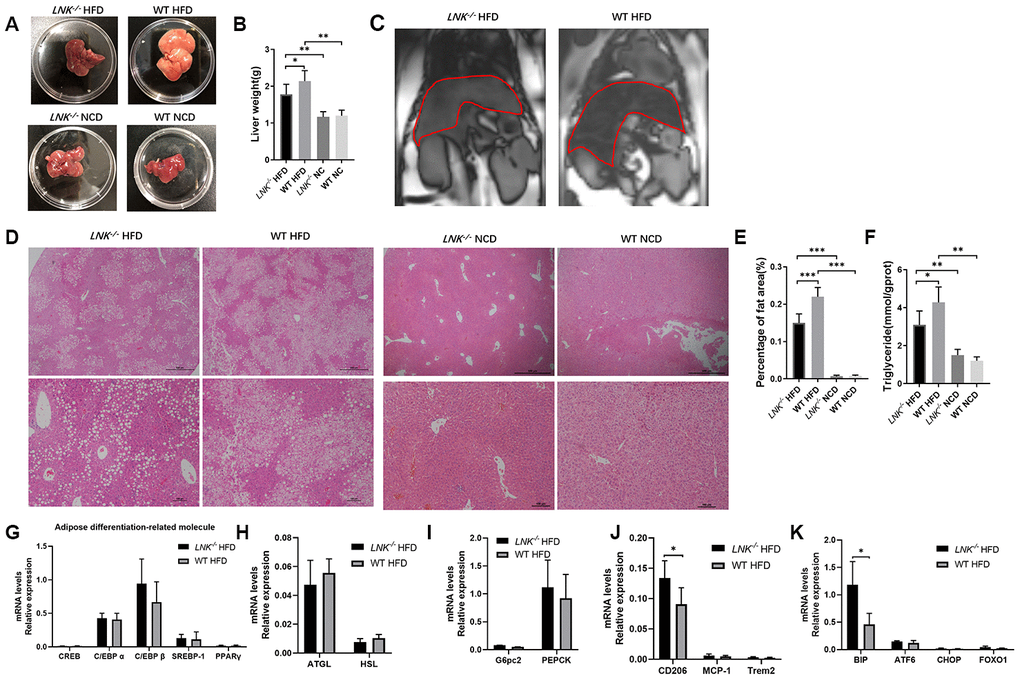 HFD-induced obesity can lead to hepatosteatosis, and we found that the deletion of LNK alleviated the hepatic lipid profile in HFD mice (Figure 4). The anatomy and out-of-phase MRI of the liver showed increased lipid deposition in WT mice (Figure 4A–4C). Histological analysis of the liver showed that the severity of hepatic steatosis in the liver was increased with HFD; and WT mice developed more severe steatosis than LNK-/- mice, with increased hepatic triglycerides (Figure 4D–4F). Markers of adipose differentiation (Figure 4G), lipolysis (Figure 4H) and gluconeogenesis (Figure 4I) were not different between genotypes. CD206 and binding immunoglobulin protein (BIP) were decreased in the livers of LNK-/- HFD mice (Figure 4J, 4K), which indicated a reduction in inflammation and endoplasmic reticulum stress.