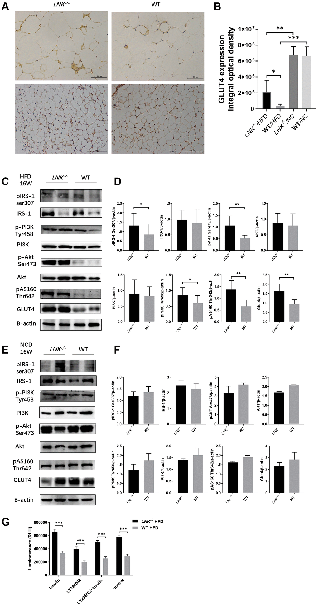 Since insulin regulates glucose transporter GLUT4 in adipose and muscle tissues, it seemed probable that adipose GLUT4 levels were elevated in LNK-/- mice. To test this hypothesis, we measured adipose GLUT4 by WB and IHC, and found that high-fat diet-fed LNK-/- mice showed marked improvement in glucose transport, however on the chow diet, LNK deficiency did not significantly alter glucose transport (Figure 5A–5C). Furthermore, we found that the insulin signaling pathway was involved. Levels of IRS1 serine phosphorylation, PI3K tyrosine phosphorylation, Akt serine phosphorylation and AS160 threonine phosphorylation adipose tissue decreased in wild-type mice compared with LNK-/- mice after 16-weeks of HFD. There were no significant differences in the phosphorylation levels of insulin signaling molecules between WT and LNK-/- mice with standard chow diet (Figure 5E, 5F). Insulin-stimulated glucose uptake in primary adipocytes was significantly improved with LNK knockout. Ex vivo administration of 50 μM LY294002, an inhibitor of phosphatidylinositol 3-kinase, attenuated the insulin-induced glucose uptake in adipocytes derived from VAT of LNK-/- mice (Figure 5G).