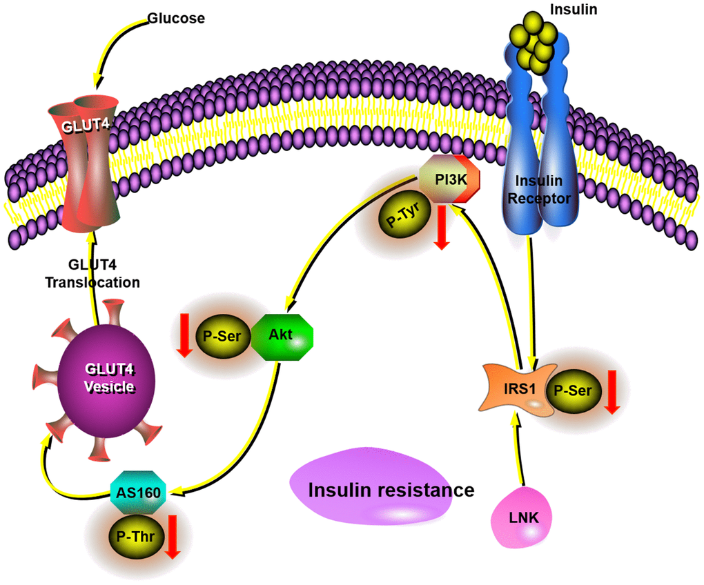 Given the magnitude of the effects of LNK, we conducted detailed in vivo studies to elucidate the mechanisms of LNK-induced insulin resistance. LNK mutations affecting the SH2 domain influenced a variety of signaling pathways [8, 31–33]. LNK regulated the PI3-kinase as reflected by Akt phosphorylation [34]. With respect to more in-depth mechanisms, we found that LNK led to decreased insulin-stimulated IRS1 serine phosphorylation, PI3K tyrosine phosphorylation, Akt serine phosphorylation, AS160 threonine phosphorylation and GLUT4 expression. Based on these studies, we suggest that intracellular LNK could lead to the inhibition of IRS1 serine phosphorylation and downstream signaling. Here, we provided evidence that LNK was a regulator of the insulin signaling pathway and a major cause of impaired glucose metabolism, the defining feature of insulin resistance.