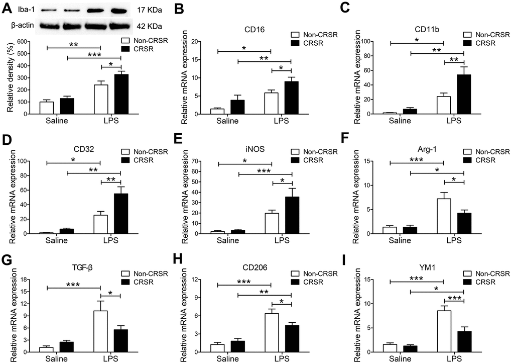 LPS-induced systemic inflammation activates microglia and promotes their polarization toward the M1 phenotype [30]. The microglia marker ionized calcium-binding adapter molecule 1 (Iba1) is expressed at all microglia activation stages, and its expression increases as activation progresses [31]. CRSR increased hippocampal Iba1 expression (CRSR: F1,20 = 5.280, P = 0.0325; LPS: F1,20 = 46.12, P < 0.0001; interaction (CRSR × LPS): F1,20 = 1.303, P = 0.2672) compared to the non-CRSR group in LPS-treated mice, but not in saline-treated mice (Figure 3A). Moreover, CRSR increased levels of the microglial M1 markers CD16 (CRSR: F1,20 = 7.132, P = 0.0147; LPS: F1,20 = 21.41, P = 0.0002; interaction (CRSR × LPS): F1,20 = 0.1226, P = 0.7299), CD11b (CRSR: F1,20 = 8.205, P = 0.0096; LPS: F1,20 = 32.91, P < 0.0001; interaction (CRSR × LPS): F1,20 = 4.186, P = 0.0546), CD32 (CRSR: F1,20 = 9.851, P = 0.0052; LPS: F1,20 = 43.74, P < 0.0001; interaction (CRSR × LPS): F1,20 = 4.925, P = 0.0382), and iNOS (CRSR: F1,20 = 3.594, P = 0.0725; LPS: F1,20 = 31.05, P < 0.0001; interaction (CRSR × LPS): F1,20 = 2.712, P = 0.1152), but decreased levels of the microglial M2 markers Arg-1 (CRSR: F1,20 = 3.691, P = 0.0691; LPS: F1,20 = 31.54, P < 0.0001; interaction (CRSR × LPS): F1,20 = 3.609, P = 0.0720), TGF-β (CRSR: F1,20 = 1.524, P = 0.2313; LPS: F1,20 = 20.08, P = 0.0002; interaction (CRSR × LPS): F1,20 = 4.848, P = 0.0396), CD206 (CRSR: F1,20 = 1.736, P = 0.2026; LPS: F1,20 = 52.79, P < 0.0001; interaction (CRSR × LPS): F1,20 = 5.614, P = 0.0280), and YM1 (CRSR: F1,20 = 10.04, P = 0.0048; LPS: F1,20 = 47.37, P < 0.0001; interaction (CRSR × LPS): F1,20 = 7.482, P = 0.0127) compared to the non-CRSR group in LPS-treated mice, but not in saline-treated mice (Figure 3B–3I).
