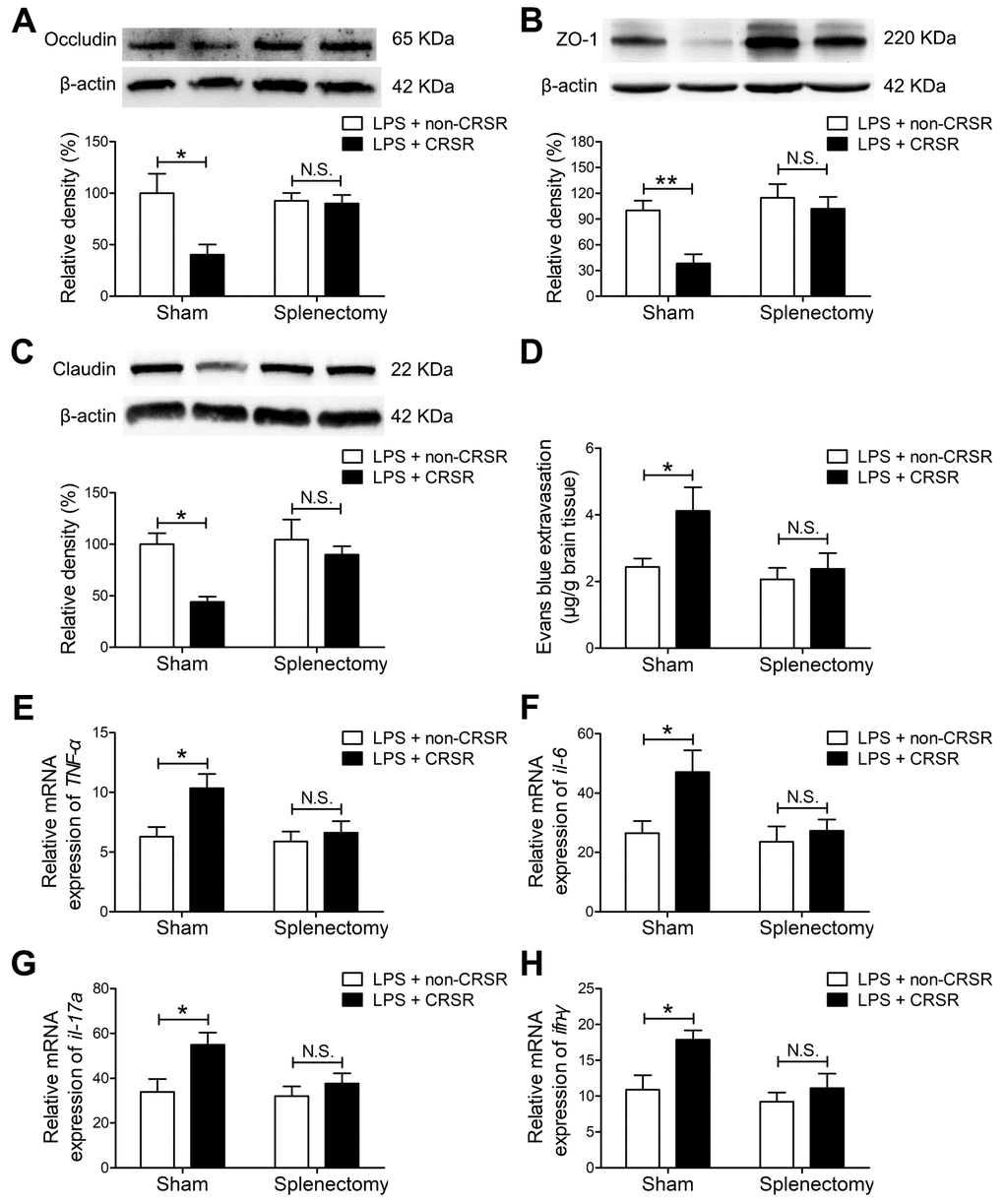 In addition, splenectomy blocked CRSR-mediated exacerbation of the LPS-induced increase in Evans blue extravasation into the brain (LPS + CRSR: F1,20 = 4.353, P = 0.0499; Splenectomy: F1,20 = 4.893, P = 0.0388; interaction ((LPS + CRSR) × Splenectomy: F1,20 = 2.028, P = 0.1698) (Figure 5D).