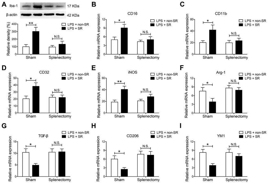 Splenectomy blocked the enhancing effects of CRSR on LPS-induced increase in microglial transition to M1 phenotype