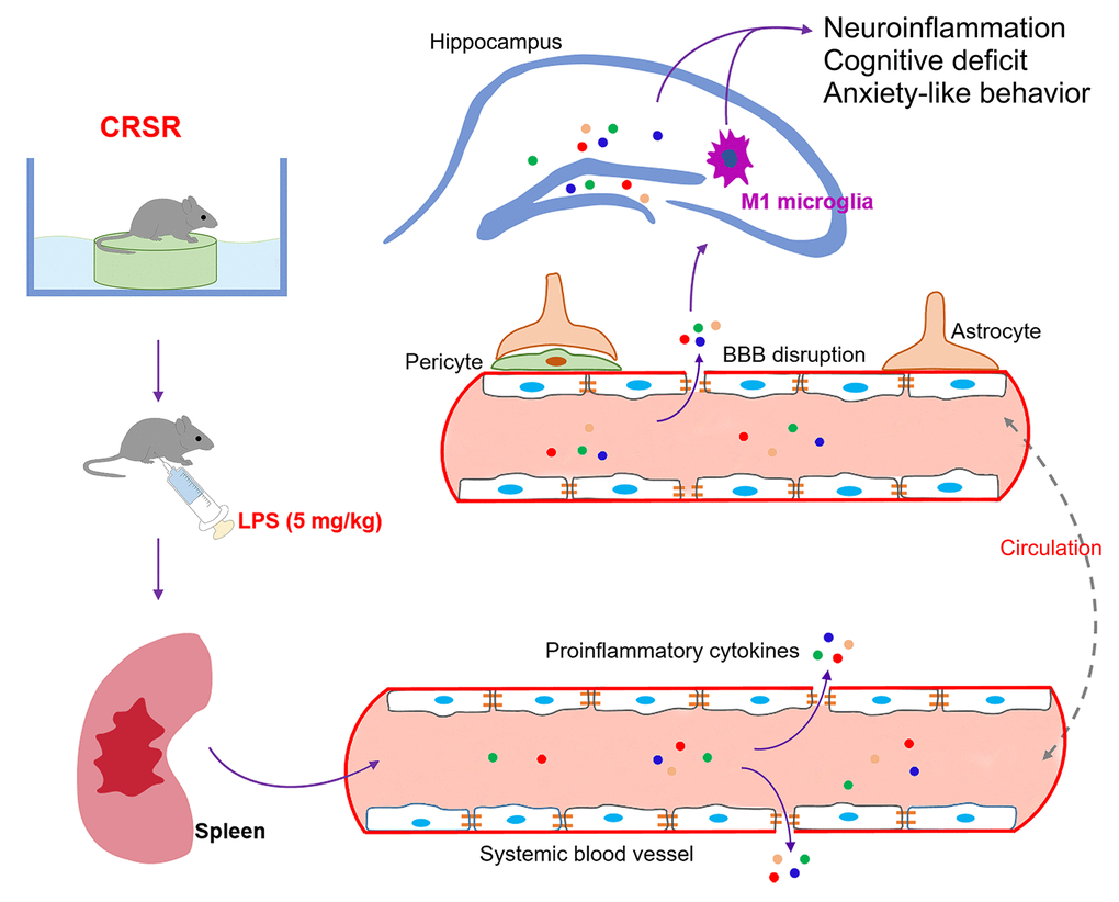 In summary, we demonstrated for the first time in this study that CRSR increased vulnerability to LPS-induced systemic inflammation, hippocampal neuroinflam-mation, BBB disruption, transition of microglia to the M1 phenotype, cognitive deficits, and anxiety-like behavior in mice. We also identified a unique and essential role for the spleen in the enhancing effects of CRSR on LPS-induced central nervous system damage.