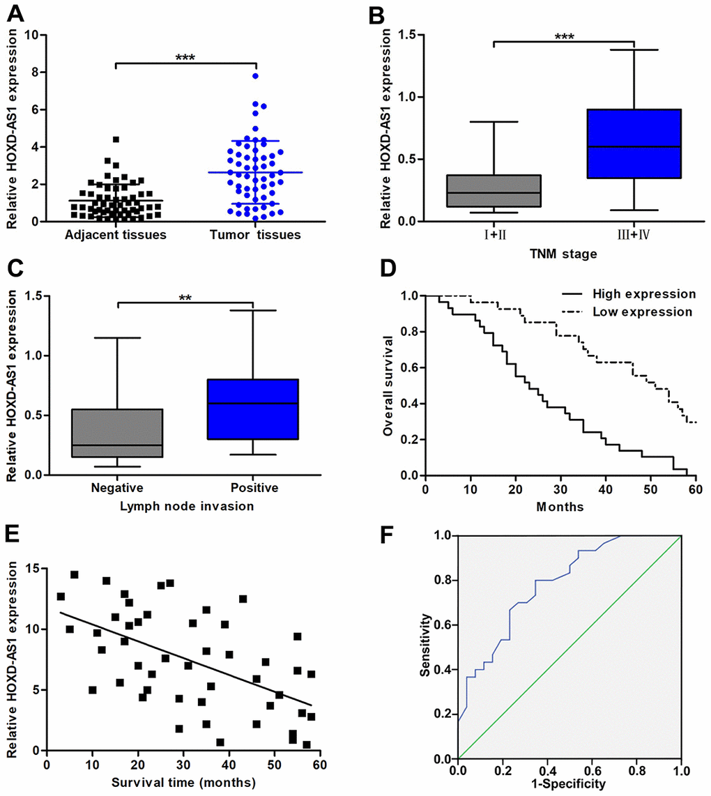 HOXD-AS1 has been reported to be highly expressed in a variety of digestive system tumors, such as gastric cancer, hepatocellular carcinoma, and colorectal carcinoma. However, its function in CCA is still unclear. After database The Cancer Genome Atlas (TCGA) analysis, we found that the expression of HOXD-AS1 was upregulated in CCA tissues (P < 0.001, Supplementary Figure 1A). Therefore, we intend to further confirm the functional role of HOXD-AS1 in CCA through basic experiments. As analyzed in TCGA database, we confirmed that HOXD-AS1 was significantly overexpressed in CCA tissues compared with that in paired adjacent nontumor bile duct tissues (Figure 1A). The analysis of the clinicopathological correlation confirmed that increased HOXD-AS1 was dramatically associated with lymph node invasion and advanced TNM stage (Figure 1B, 1C). However, HOXD-AS1 was not associated with other clinicopathological features, including age, gender, tumor location, histological type, differentiation grade, HBV infection, serum CA19-9 level, and serum CEA level (Table 1). By dividing all patients into high HOXD-AS1 expression group and low expression group, survival correlation was also analyzed in this study. The results showed that patients in increased HOXD-AS1 group presented worse overall survival (OS) than those in decreased HOXD-AS1 group (log rank P < 0.001, Figure 1D). In addition, Pearson correlation analysis confirmed that HOXD-AS1 expression was negatively associated with the survival of CCA patients (r = -0.5592, P < 0.001, Figure 1E). These findings suggested that HOXD-AS1 was a regulator of the progression of CCA. Hence, we further assessed the prognostic value of HOXD-AS1 by univariate and multivariate analyses. The univariate analysis revealed that high HOXD-AS1 expression, advanced TNM stage, and lymph node invasion were associated with prognosis of CCA patients. The multivariate analysis uncovered that high HOXD-AS1 expression and advanced TNM stage were independent risk factors of prognosis of CCA patients (Table 2). As shown in Figure 1F, the receiver operating characteristic curve (ROC) analysis indicated that the value of area under curve (AUC) of HOXD-AS1 as a prognostic marker was 0.786 (95% CI: 0.668-0.904) with 80% sensitivity and 65.4% specificity (P < 0.001).