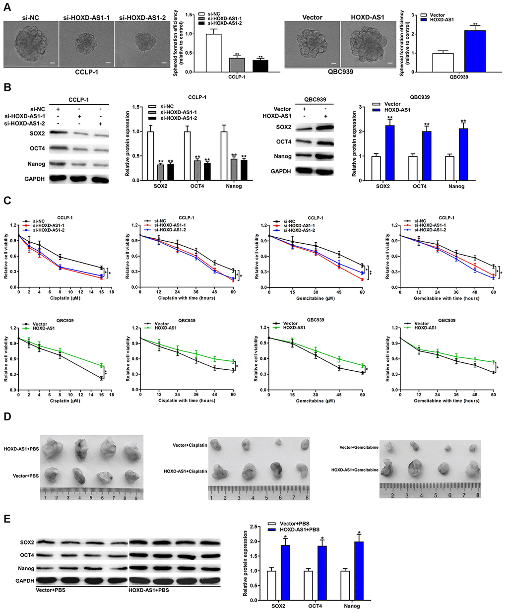We further explored the effect of HOXD-AS1 on chemo-resistance in vivo by applying nude mice model. QBC939 cells transfected with HOXD-AS1 plasmid or vector were subcutaneously injected into mice. Meanwhile, the mice were treated with phosphate-buffered saline (PBS), cisplatin or gemcitabine by intraperitoneal injection. As shown in Figure 3D, HOXD-AS1 overexpression significantly promoted tumor growth compared with the vector group, and treatment with cisplatin or gemcitabine markedly restrained tumor growth compared with PBS controls. More importantly, HOXD-AS1 heightened the chemo-resistance of tumors on treatment of cisplatin and gemcitabine in vivo. In addition, we detected the expression of stem markers in HOXD-AS1 + PBS and vector + PBS groups. The results displayed that HOXD-AS1 increased the expression of SOX2, OCT4 and Nanog in vivo compared with controls (Figure 3E).