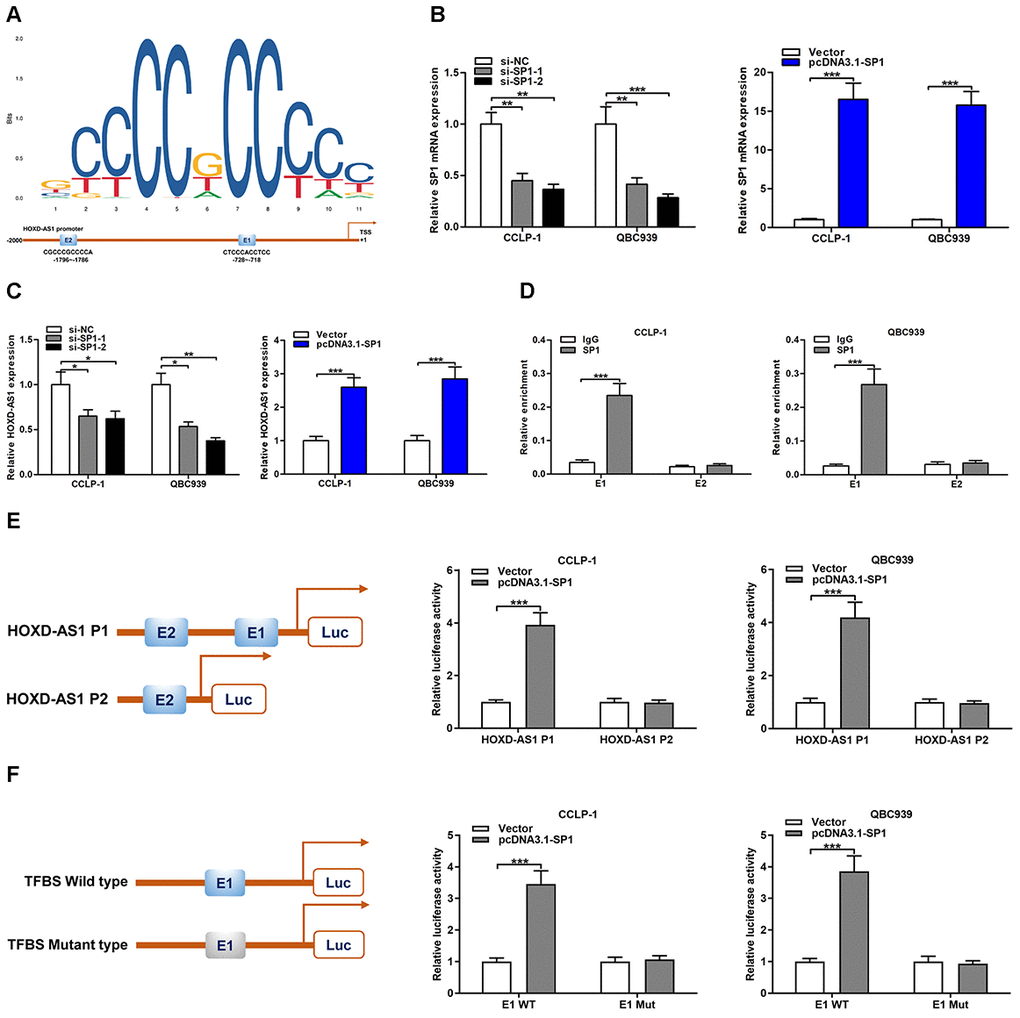 SP1 was demonstrated to promote various target gene transcription by acting as a transcription factor [23]. By the JASPAR database (http://jaspar.genereg.net/) detection, two binding sites of SP1 (E1 and E2) were identified in HOXD-AS1 promoter region (Figure 4A). To further explore the regulatory function of SP1 on HOXD-AS1, SP1 was severally knocked down or amplified in CCA cells (Figure 4B). The qRT-PCR assays verified that SP1 knockdown decreased HOXD-AS1 transcription and SP1 overexpression increased HOXD-AS1 transcription in CCLP-1 and QBC939 cells (Figure 4C). To further determine the binding of SP1 to HOXD-AS1 promoter, chromatin immunoprecipitation (ChIP) assays revealed that SP1 antibody dramatically recruited the fragments of transcription factor binding site (TFBS) E1 (Figure 4D). Furthermore, luciferase reporter plasmid with E1 and E2 was activated by SP1, but luciferase reporter plasmid with E2 was not affected (Figure 4E). In addition, SP1 activated luciferase reporter plasmid with wild type E1, but luciferase reporter plasmid with mutant type E1 was not activated (Figure 4F). These results suggested that SP1 promoted HOXD-AS1 transcription by directly binding to TFBS E1 in HOXD-AS1 promoter region.