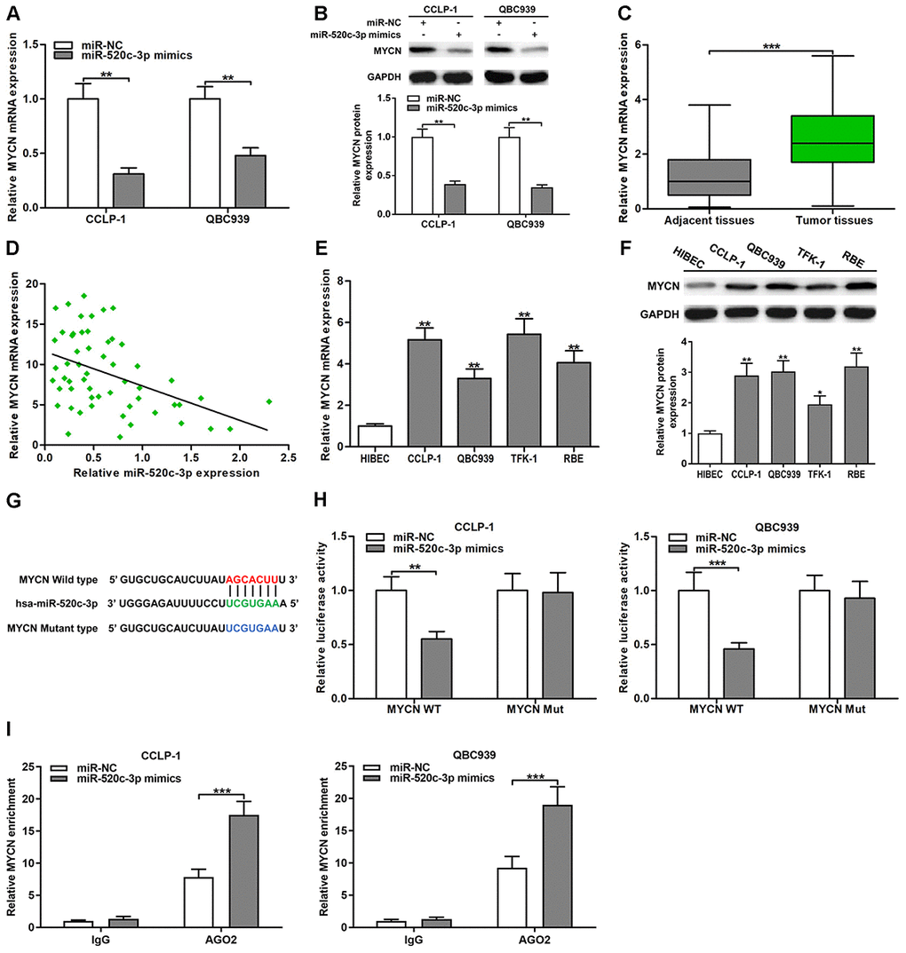 Oncogene MYCN has been testified to play a critical regulatory role in many digestive system tumors [24]. TCGA database confirmed that the expression of MYCN was increased in CCA tissues (P < 0.001; Supplementary Figure 1E). By online database StarBase prediction, MYCN and HOXD-AS1 had the same binding site to interact with miR-520c-3p. Therefore, we decided to verify the correlation of MYCN and miR-520c-3p. The knockdown efficiency of si-MYCN in CCLP-1 and QBC939 were shown in Supplementary Figure 1F. As displayed in Figure 6A, upregulated miR-520c-3p inhibited the expression of MYCN mRNA in CCLP-1 and QBC939 cells. Similarly, increased miR-520c-3p also suppressed MYCN protein expression (Figure 6B). By qRT-PCR analysis, MYCN expression was remarkably upregulated in CCA tissues compared with that in paired adjacent nontumor bile duct tissues (Figure 6C). Moreover, MYCN expression was negatively associated with miR-520c-3p expression (r = -0.4449, P < 0.001, Figure 6D). In addition, MYCN was also overexpressed in CCA cells both at mRNA and protein levels (Figure 6E, 6F). Subsequently, luciferase reporter assays confirmed that luciferase activity of MYCN wild type was restrained by miR-520c-3p mimics, but miR-520c-3p mimics didn’t affect luciferase activity of MYCN mutant type (Figure 6G, 6H). Besides, AGO2 RIP assays demonstrated that miR-520c-3p mimics dramatically enriched MYCN mRNA in CCA cells (Figure 6I). The findings indicated that miR-520c-3p directly bound MYCN 3’UTR to repress MYCN expression in CCA cells.