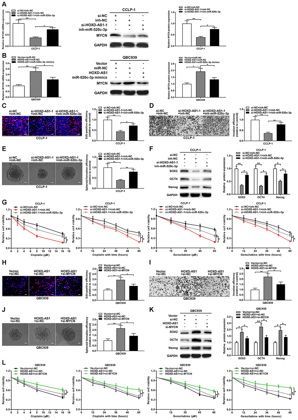 To further confirm the regulation of HOXD-AS1/miR-520c-3p/MYCN in CCA, we conducted function-related rescue experiments. As shown in Figure 7A, HOXD-AS1 knockdown inhibited the expression of MYCN both at mRNA and protein levels, while simultaneously silencing miR-520c-3p could partially reverse the suppressive function of HOXD-AS1 knockdown. Likewise, HOXD-AS1 overexpression promoted MYCN expression, while upregulated miR-520c-3p could partially save the function of HOXD-AS1 overexpression (Figure 7B). EdU assay confirmed that knocking down HOXD-AS1 inhibited the proliferation of CCLP-1 cells, while miR-520c-3p knockdown could partially reverse the function of HOXD-AS1 knockdown (Figure 7C). In transwell assay, miR-520c-3p knockdown could also partially rescue the invasive inhibition induced by HOXD-AS1 knockdown (Figure 7D). In terms of stemness maintenance and chemo-resistance, silencing HOXD-AS1 restrained spheroid formation and stem marker expression, and sensitized CCLP-1 cells to treatment of cisplatin and gemcitabine, while knocking down miR-520c-3p could partially save the effect of HOXD-AS1 knockdown (Figure 7E–7G).