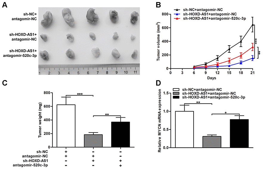 The effect of HOXD-AS1 on CCA tumorigenesis in vivo was evaluated through the nude mice model. As displayed in Figure 8A–8C, HOXD-AS1 knockdown repressed the tumor volumes and the tumor weights, while cotransfected antagomir-520c-3p could partially reverse the repressive effect of HOXD-AS1 knockdown in nude mice. In addition, the expression of MYCN in tumor xenograft was detected by qRT-PCR. The results showed that knocking down HOXD-AS1 restrained MYCN expression in tumor xenograft, but silencing miR-520c-3p could partially rescue the suppressive function caused by HOXD-AS1 knockdown (Figure 8D). These findings indicated that HOXD-AS1/miR-520c-3p/MYCN contributed to CCA tumorigenesis in vivo.