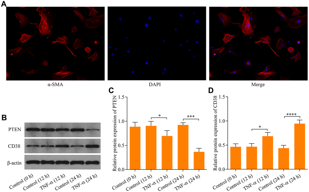 The effect of TNF-α stimulation on expression of PTEN and CD38 in ASM cells were investigated initially using primary mouse ASM cells (Figure 1A). Exposure of ASM cells to TNF-α caused a significant decrease in PTEN expression (Figure 1B, 1C), while a marked increase in CD38 expression was observed (Figure 1B, 1D). These data indicate that TNF-α stimulation alters PTEN and CD38 expression in ASM cells.
